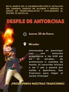 El jueves 20 de enero 2022, se realizará el Desfile de Antorchas en punto de las 7pm, que saldrá del mirador Pedro Vargas en salida Real a Querétaro, misma vialidad por la que bajará el contingente que lidera la caracterización de Ignacio de Allende en caballo, seguido por personajes con indumentaria característica a los insurgentes y pueblo enardecido de aquella época portando antorchas, todos ellos sanmiguelenses entusiastas pertenecientes al grupo de tradicionalistas y aficionados al teatro, quienes invitan al público a participar igualmente caracterizados, solo deberán vestir de manta y se les proporcionará la antorcha. Este grupo representa el levantamiento Insurgente cuando Ignacio Allende encabezó el movimiento en este municipio.