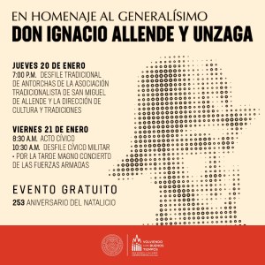 «Esta tradición sanmiguelense rendirá homenaje al prócer nacional con la marcha de la banda de guerra ‘Dragones de la reina’, la reseña en voz alta del origen de esta tradición por Eleazar Romero, seguido por dos poemas a Don Ignacio Allende en voz del director de Cultura y Tradiciones Acacio Martínez, la declamación de una oda por el Coro de la Casa de la Cultura y la interpretación del Himno Nacional por parte de Benjamín Lara, todo el evento amenizado por piezas musicales por parte de un grupo local de cuerdas para deleite de los sanmiguelenses, turistas y visitantes, quienes festejarán en familia las aportaciones esenciales de Ignacio Allende para que hoy en día se viva en un México libre» informó Gobierno Municipal de San Miguel de Allende 2021-2024.