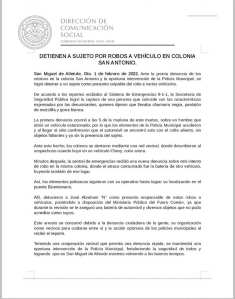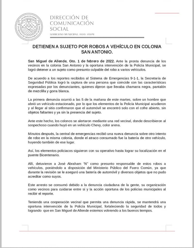 1 de febrero de 2022 Equipo Redacción Boletin informativo detención de masculino en colonia San Antonio de San Miguel de Allende