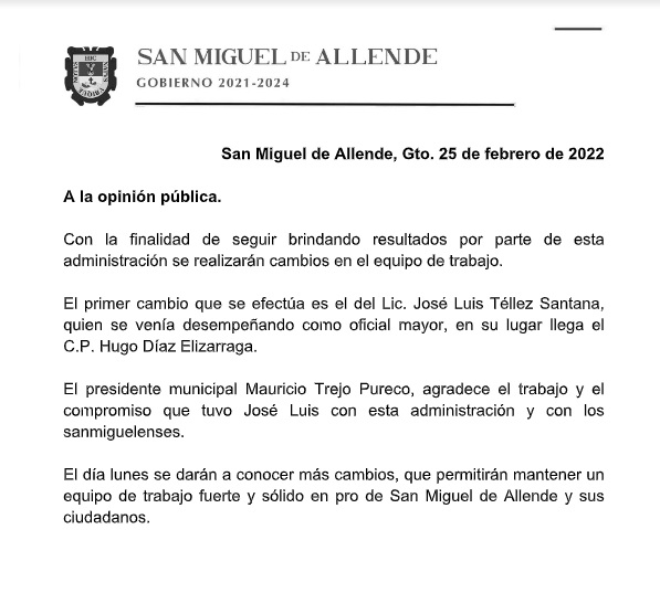 San Miguel de Allende, Gto., viernes 25 de febrero 2022.- Mediante un comunicado del gobierno municipal 2021-2024anunicó que se realizarán cabos dentro de la administración a partir del lunes y el primer cambio se trata del del Lic. José Luis Téllez Santana, quien se venía desempeñando como oficial mayor, en su lugar llega el C.P. Hugo Díaz Elizarraga. No se especifica la situación de dichos cambios solo que los cambios “permitirán mantener un equipo de trabajo fuerte y sólido en pro de San Miguel de Allende y sus ciudadanos”