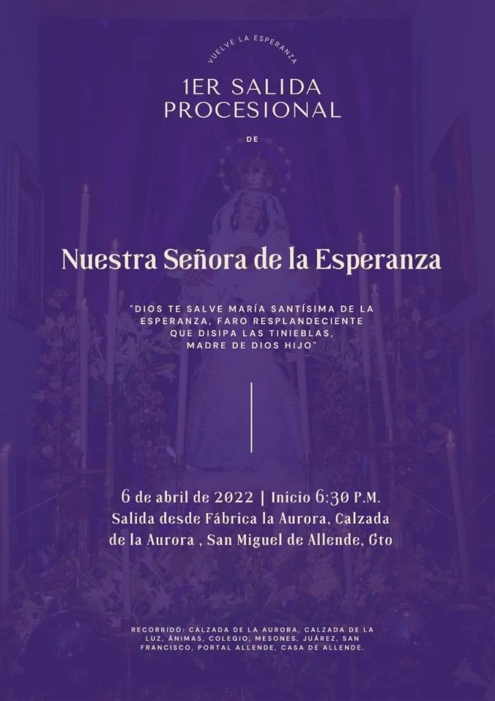 - 06 DE ABRIL 2022: PROCESIÓN DE LA ESPERANZA: la Procesión de la Esperanza que se realizará POR PRIMERA OCASIÓN el próximo 06 de abril 2022 en San Miguel de Allende. RECORRIDO: Calzada de la Aurora, Calzada de la Luz, Ánimas, Colegio, Mesones, Juarez, San Francisco, Portal Allende y Museo Casa de Allende.
