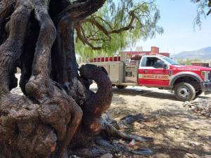 SAN MIGUEL DE ALLENDE, GTO., SÁBADO 14 DE MAYO 2023.- Contrario a lo que dice la canción popular, que el árbol de pirul «no sirve ni pa’ arder» en esta ocasión si ardió el pirul de la comunidad de Sosnabar y sufrió daños internos, pero que logró ser apagado por bomberos del patronato de Cuerpo de Bomberos de San Miguel de Allende A.C.