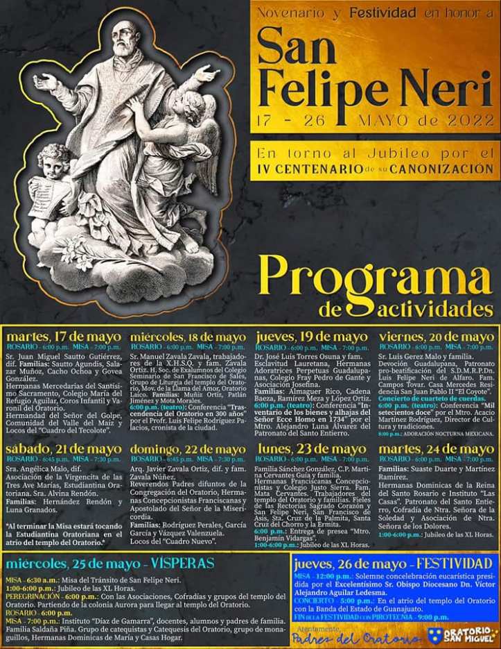 -6pm, peregrinación, con las asociaciones, cofradías y grupos del Templo del Oratorio, partiendo de la colonia Aurora para arribar al Templo del Oratorio de San Felipe Neri.