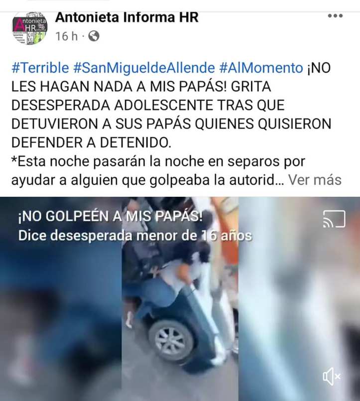San Miguel de Allende, Gto., Martes 31 de mayo 2022.- Fueron 4 detenidos; papá, mamá y tío de una menor de edad (y el detenido previamente) quiénes se detuvieron a ayudar a un un hombre que estaba siendo golpeado por la autoridad, pero los policías se fueron contra la familia sanmiguelense.