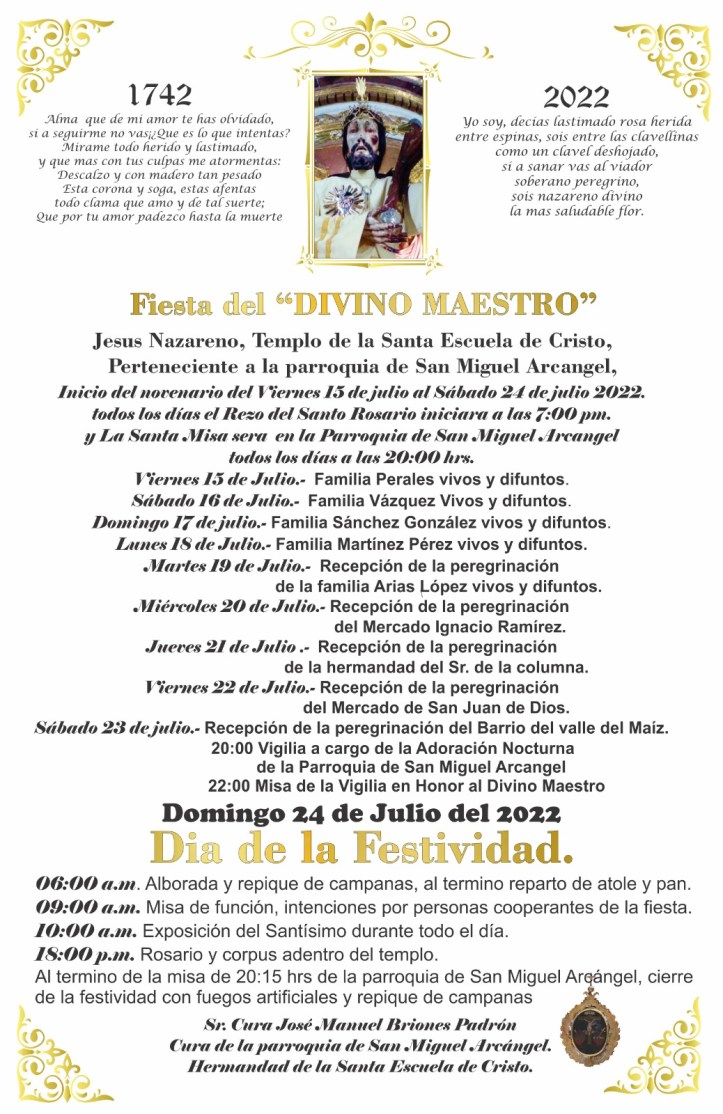 SAN MIGUEL DE ALLENDE, GTO., JUEVES 14 DE JULIO 2022.- El Templo de la Santa Escuela de Cristo, conocida como “La Parroquia Vieja” o “El Templo de San Rafael” ubicada a un anexo de la Parroquia de San Miguel Arcángel, iniciará el novenario de festividad del “Divino Maestro” a partir del viernes 15 de julio al 24 de julio, donde se informa que en esta edición 2022 “no habrá besamanos” por medidas de seguridad de la pandemia del covid-19.