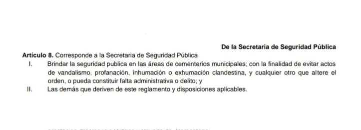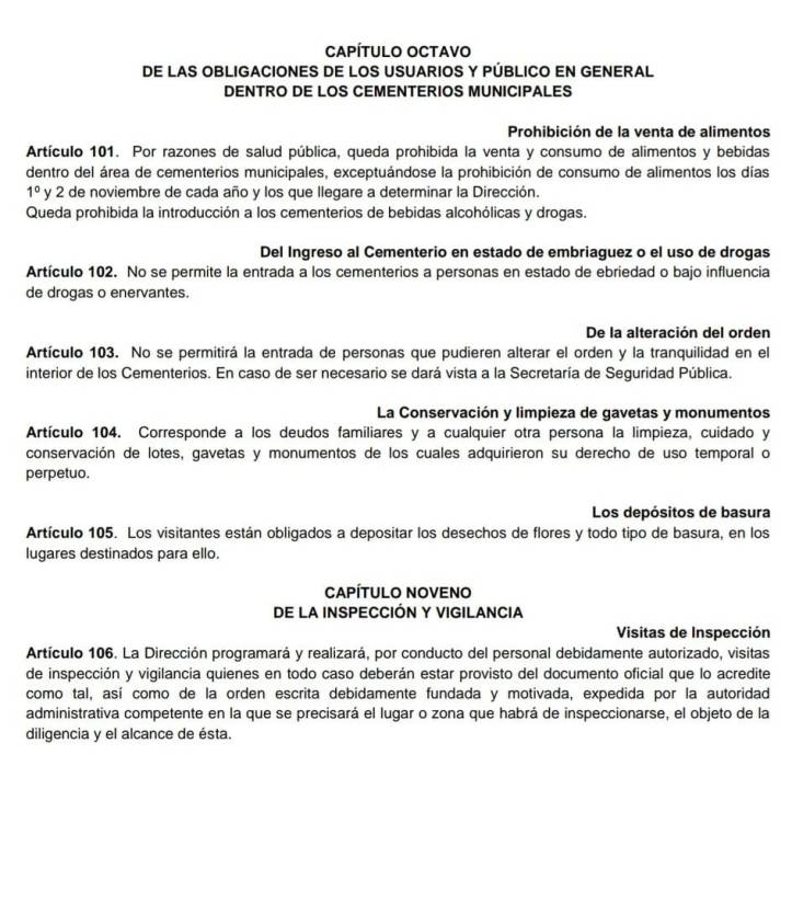 «Además del personal necesario para el desempeño de labores propias del servicio de cementerios, cada cementerio contará con vigilancia policíaca, a efecto de auxiliar al administrador en lo relacionado con el cumplimiento de este Reglamento y con la preservación del orden» detallan en el Artículo 22 del reglamento.
