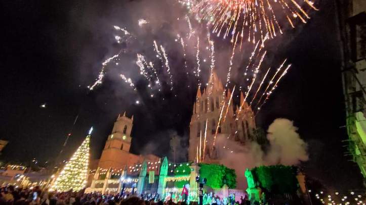 🎄 El alcalde de San Miguel de Allende arribó a las 19:13hrs al jardín principal y tras esperar a sus hijas dieron paso a la cuenta regresiva apoyado por los asistentes en la Plaza Principal, seguido de un espectáculo de pirotecnia.