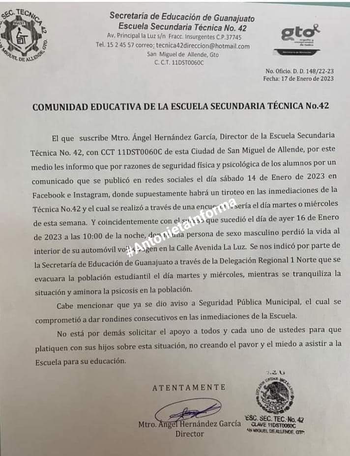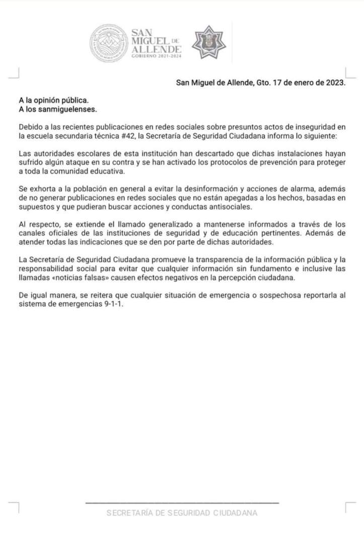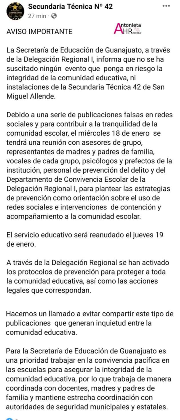 «La Secretaría de Educación de Guanajuato, a través de la Delegación Regional I, informa que no se ha suscitado ningún evento que ponga en riesgo la integridad de la comunidad educativa, ni instalaciones de la Secundaria Técnica 42 de San Miguel Allende.