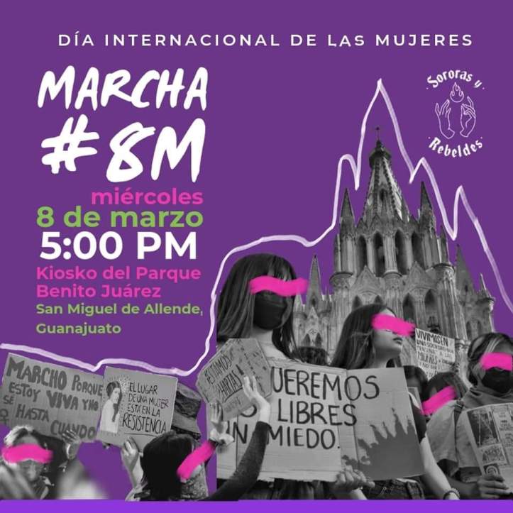 #8M | En conmemoración al Día Internacional de la Mujer, las invitamos a marchar juntas y apoderarnos de las calles de San Miguel de Allende para seguir visibilizando, exigiendo y nombrando libertad y justicia para todas las mujeres, adolescentes y niñas.