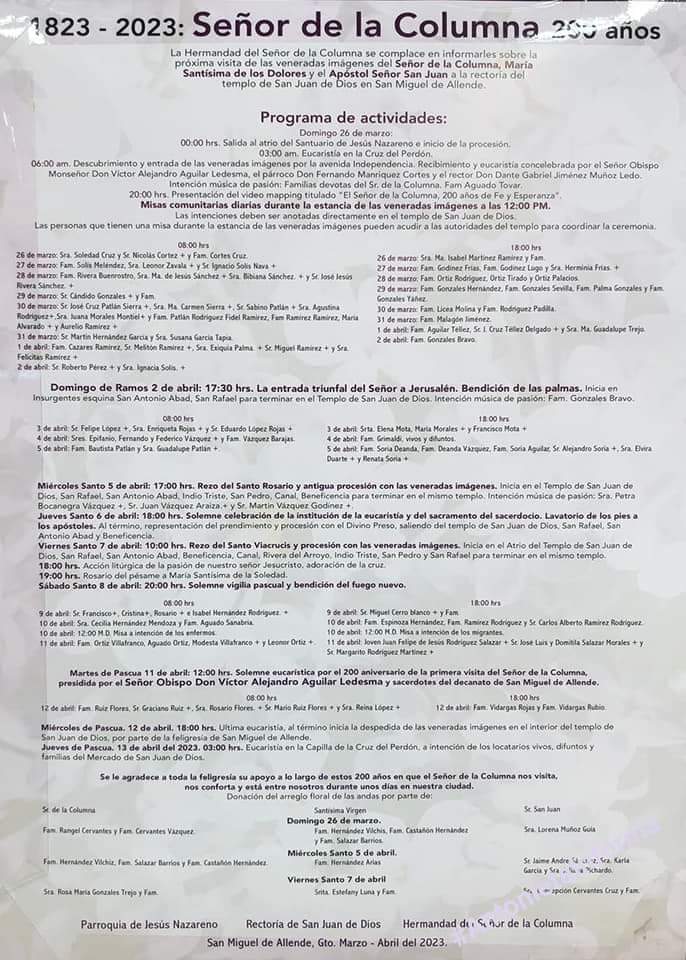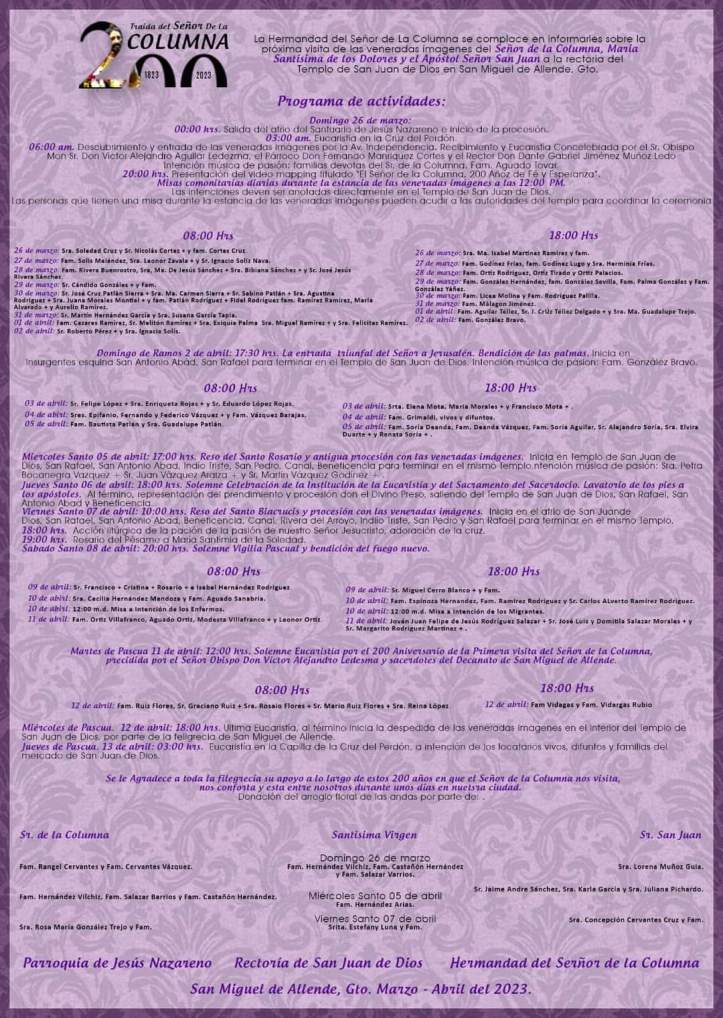 SAN MIGUEL DE ALLENDE, GTO., MARTES 14 DE MARZO 2023.- Está ya el programa de eventos para la traída del Señor de la Columna 2023 y así será este festejo por el 200 aniversario de su arribo.