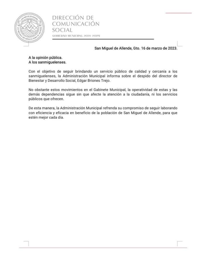 Mientras que el gobierno municipal de San Miguel de Allende 2021-2024 mediante un comunicado de prensa dirigido a la opinión pública y a los sanmiguelenses, informó hasta el 16 de Marzo 2023 que con el objetivo de seguir brindando un servicio público de calidad y cercanía a los sanmiguelenses, la Administración Municipal da a conocer sobre el «despido» del director de Bienestar y Desarrollo Social, Edgar Briones Trejo.