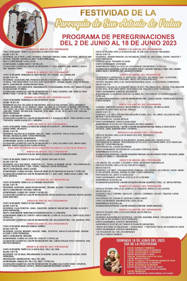 Por lo que previo al día de la festividad, cada día, a partir del 02 de junio al 18 de junio a las 6pm, se realizará el quincenario de festividad, donde saldrán de diferentes lugares del municipio peregrinaciones en honor a San Antonio de Padua, acompañado de cuadros de locos, estrellas, mojigangas y música. Estos son los recorridos: