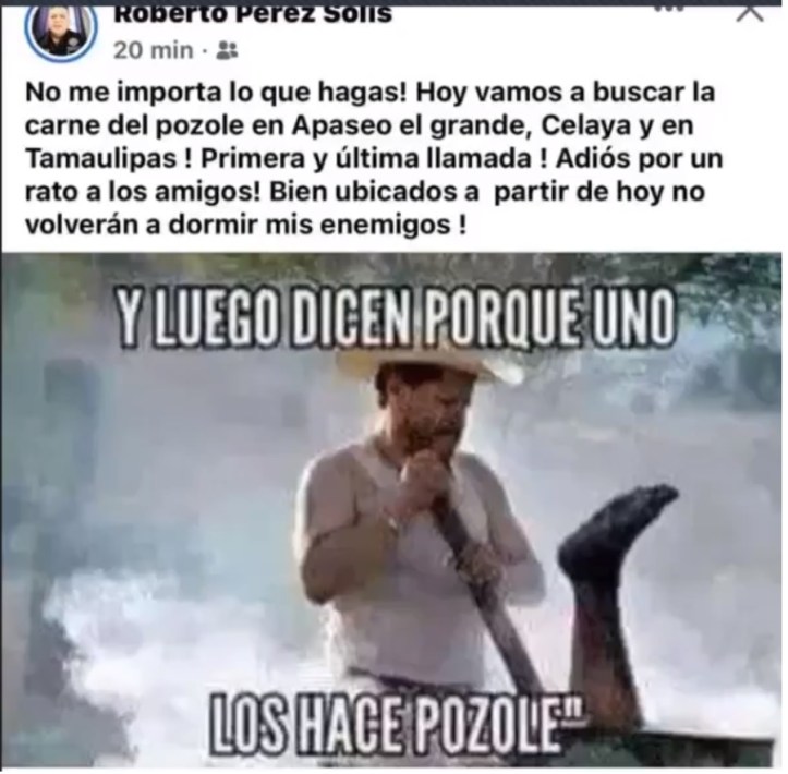 Se filtró una publicación de las redes personales del director de Protección civil de San Miguel de Allende, Roberto Pérez Solís haciendo alusión a prácticas consideradas por grupos delictivos mostrando una imagen violenta de un ‘pozolero’ disolviendo un cadáver, lanzando amenaza diciendo que ya tenia en la mira a sus enemigos.