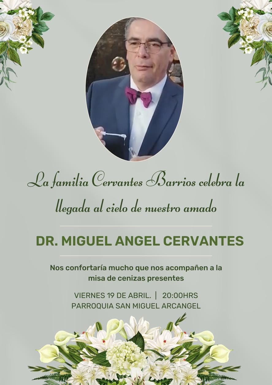 SAN MIGUEL DE ALLENDE, GTO., MIÉRCOLES 16 DE ABRIL 2024.- Este próximo Viernes 19 de Abril 2024 se realizará una Santa Misa en honor y por el eterno descanso del Dr. Miguel Ángel Cervantes Cervantes y también, bendición de cenizas presentes en la Parroquia de San Miguel Arcángel a las 20hrs (8pm)