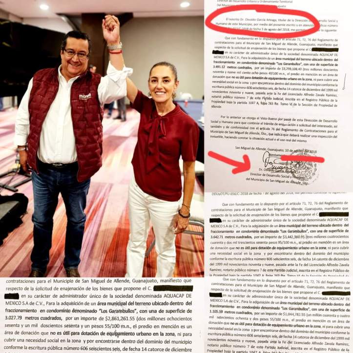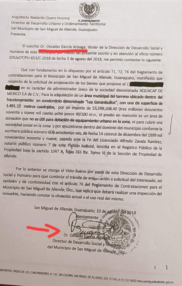 En el tema del desarrollo «Garambullos» el entonces director de Desarrollo Social y Humano del municipio de San Miguel de Allende del año 2018, OSVALDO GARCÍA ARTEAGA (Hoy candidato por MORENA 2024 a la alcaldía) fue el encargado de firmar y dar el visto bueno de enajenación (Vender o ceder la propiedad de algo u otros derechos) dentro de la administración del entonces alcalde de San Miguel de Allende (2015-2018) Ricardo Villarreal García (actualmente diputado federal con licencia y candidato por tercera ocasión a la diputación federal por San Miguel de Allende, San José Iturbide, Comonfort y 32 secciones de Celaya). Pero ¿porqué Osvaldo fue el encargado de hacer éstos cuatro trámites (DDUyOT/PU-653/C-2018 de fecha 3 de agosto 2018, también el DDUyOT/PU-655/C-2018 de fecha 7 de agosto 2018, también el trámite con número DDUyOT/PU-656/C-2018 de fecha 7 de agosto 2018, y el trámite DDUyOT/PU-657/C-2018 de fecha 8 de agosto 2018) si su dirección gubernamental no tenía nada que ver con un tema inmobiliario?