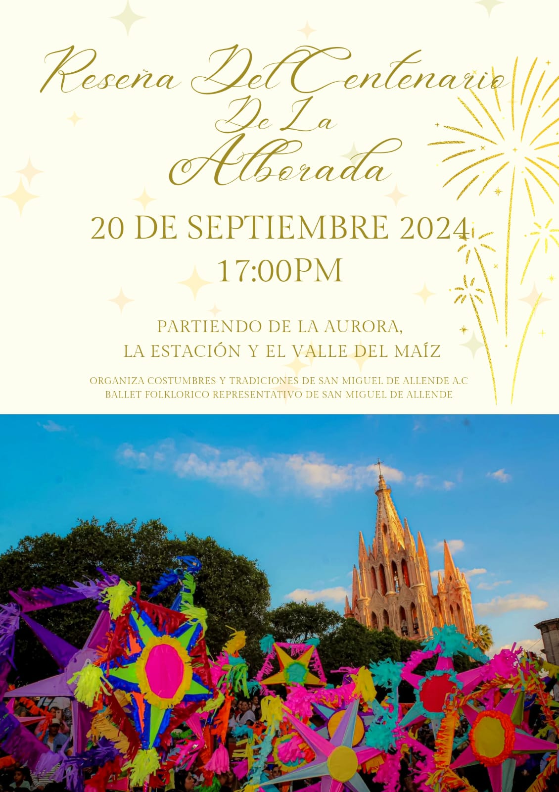 ▪️ 4. pero será el 08 de diciembre 2024 cuando se haga la conmemoración histórica de la Primer Alborada que se festejó en esta ciudad de San Miguel de Allende, donde se espera el apoyo de autoridades municipales para el realce de estos eventos y actualmente ya se encuentran planeando lo que sucederá en este Centenario.