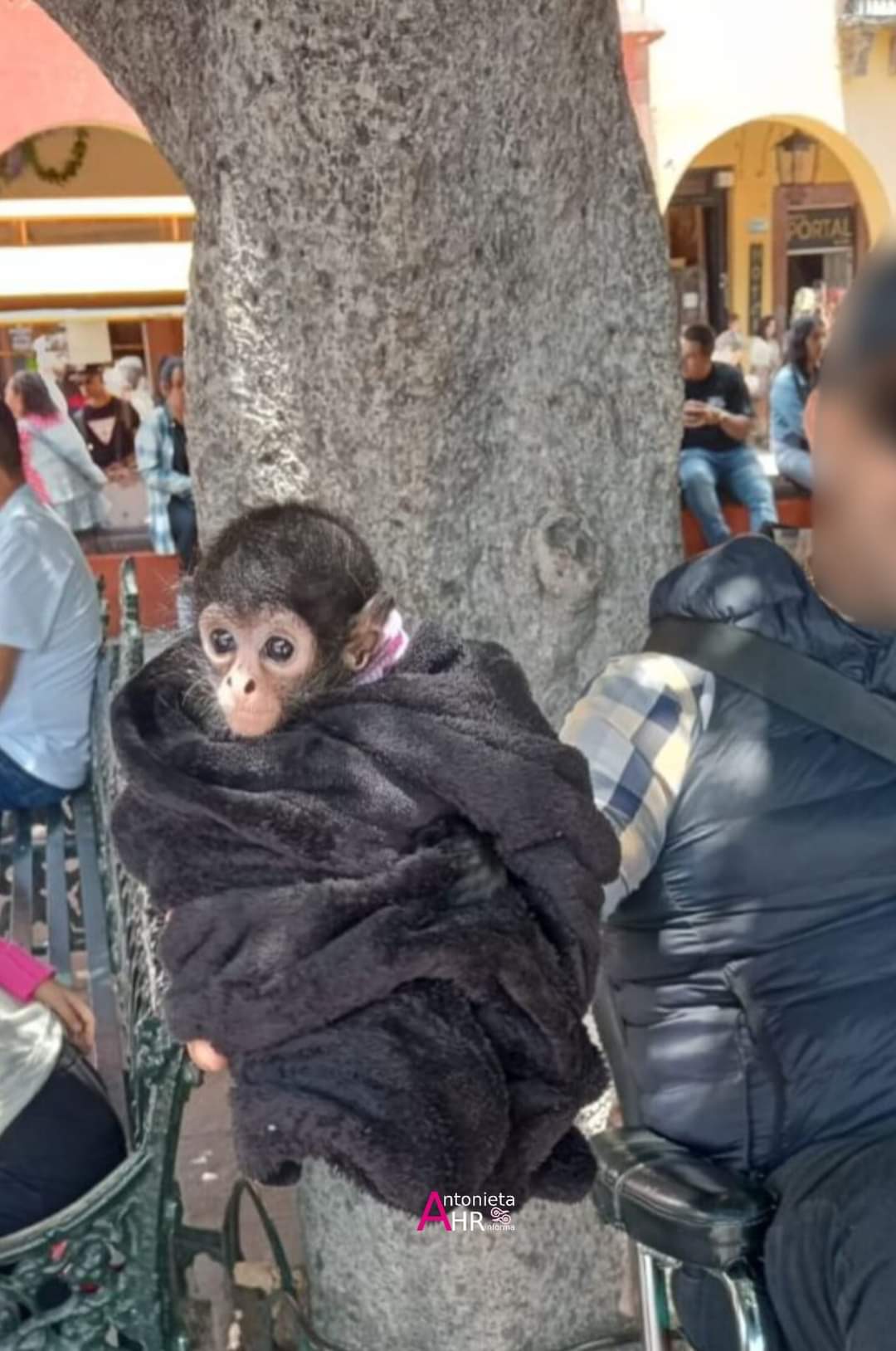 La cría la traían envueltita en una cobijita para el frio y así lucía. Se sabe que en México solo hay dos tipos de mono: el mono araña y el mono aullador.