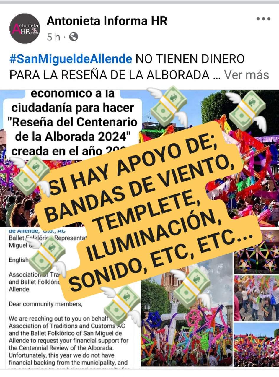 SAN MIGUEL DE ALLENDE, GTO., JUEVES 22 DE AGOSTO 2024.- Tras que se exhibiera que este año «NO TIENEN DINERO PARA LA RESEÑA DE LA ALBORADA 2024 («Reseña del Centenario de la Alborada 2024″) Y ESTAN PIDIENDO COOPERACIÓN» por el presidente de la asociación; «Costumbres y Tradiciones de San Miguel de Allende, Gto., AC, Ballet Folklórico Representativo de San Miguel de Allende» Santiago González, el gobierno municipal de San Miguel de Allende señaló que si hay apoyo en especie, solo no se les proporcionará el dinero extra que solicitaron.