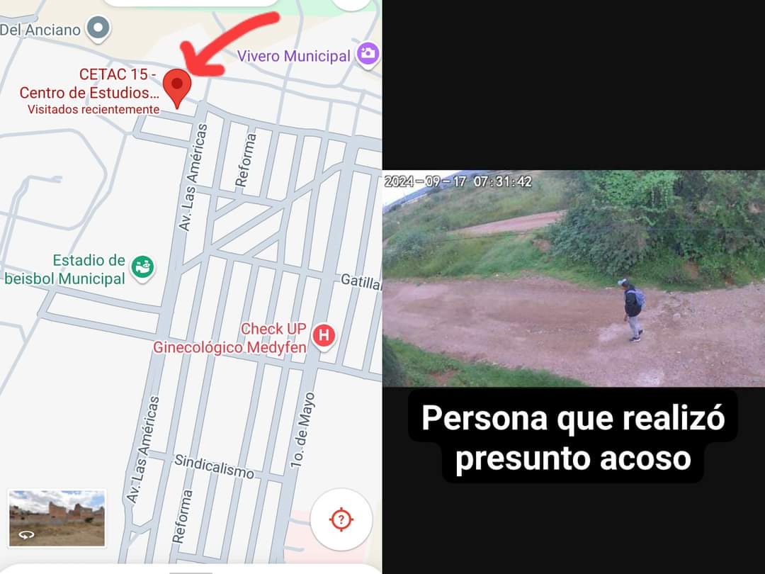 «El día martes mi hija de 14 años fue acosada verbalmente por el tipo que sale en la foto ella se dirigía camino a la preparatoria CETAC (Centro de Estudios Tecnológicos en Aguas Continentales) aprox en un horario de 7:20 a 7:30 a la altura del banco bienestar que se encuentra en palmita de landeta de la mañana, gracias a Dios se cruzó un matrimonio que la ayudaron llegar a la escuela no me gustaría que alguna otra señorita pasará por la misma situación así que unamos fuerzas y cuidemosnos una a una hoy por mi mañana por ustedes pido más vigilancia para esta zona porfavor»