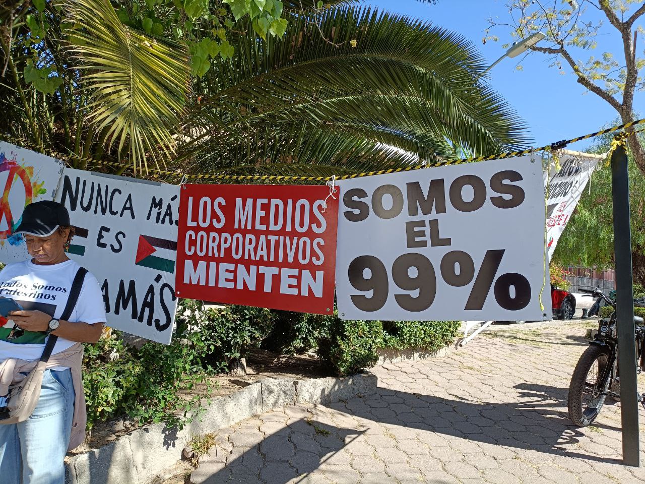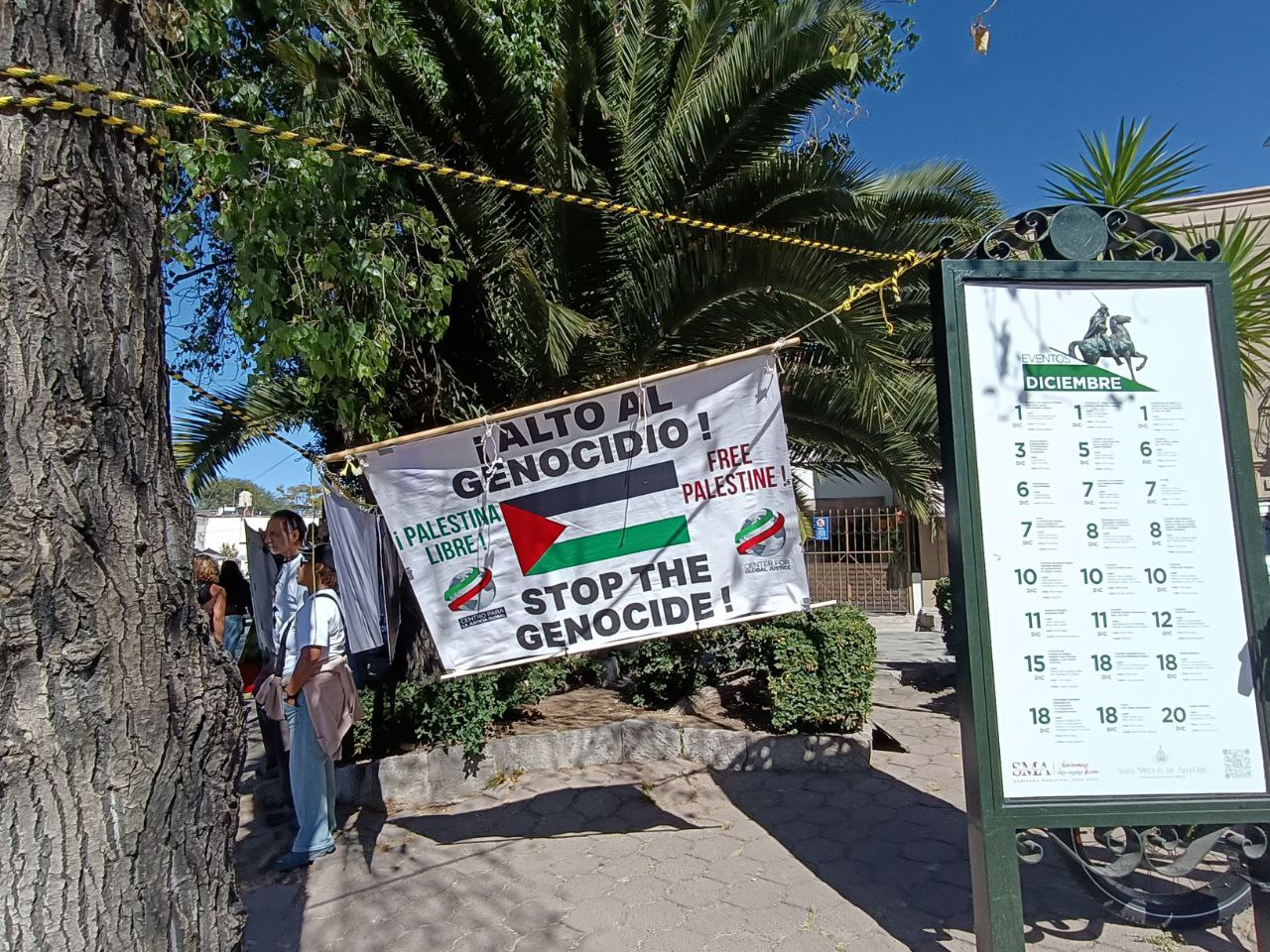 «No queremos que México sea cómplice colectivo de los crímenes de esa humanidad que perpetua el estado de Israel en Palestina» dicen los textos que reparten