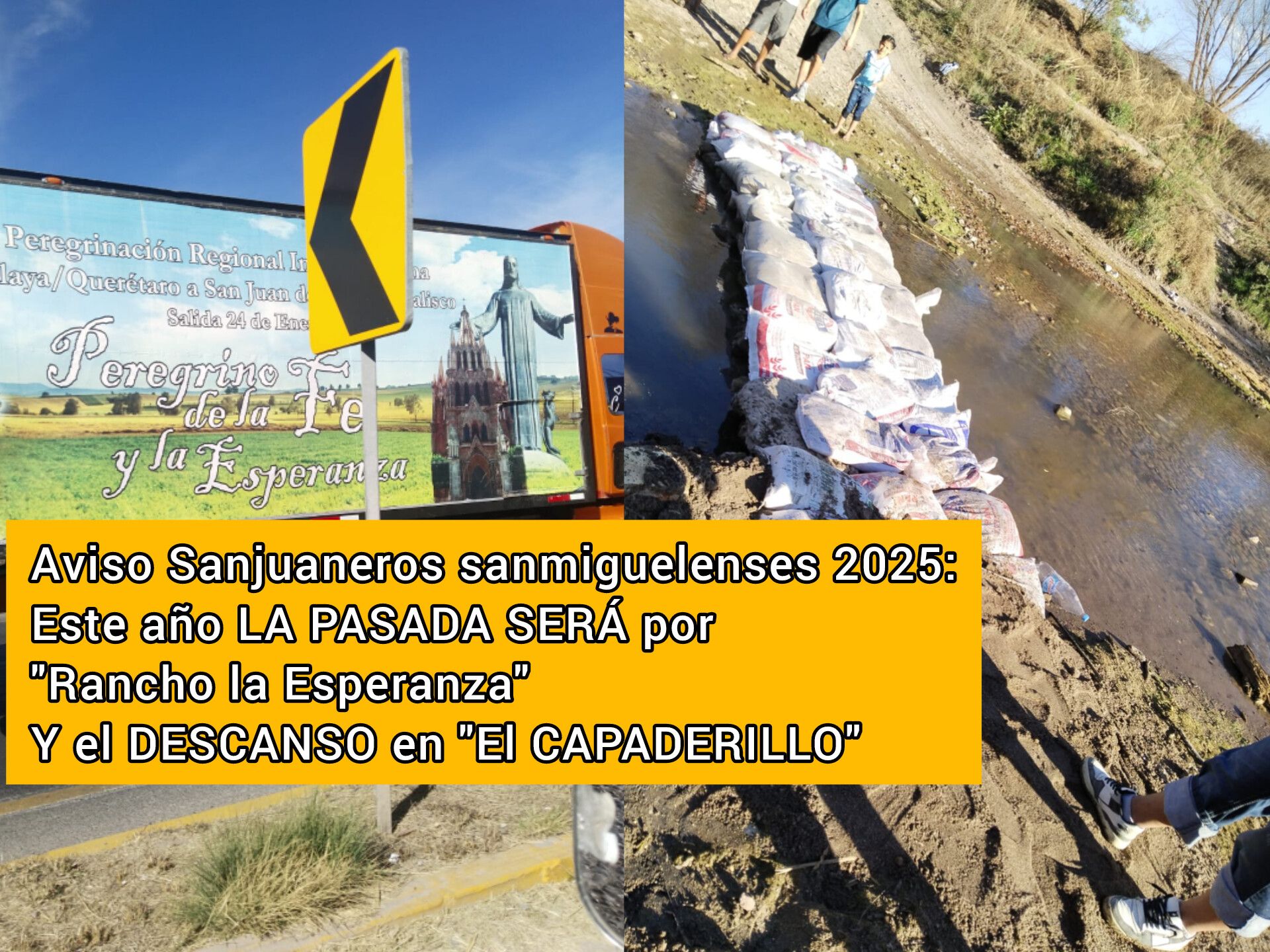 SAN MIGUEL DE ALLENDE, GTO., MARTES 21 DE ENERO 2025.- Los Sanjuaneros del 24 de enero 2025 ya se alistan, y los celadores y coordinadores dan aviso importante: ESTE AÑO SE LES INFORMA A LOS PEREGRINOS de San Miguel de Allende A SAN JUAN DE LOS LAGOS, LA PASADA SERÁ POR ‘EL RANCHO LA ESPERANZA’ Y EL DESCANSO SERÁ EN ‘EL CAPADERILLO’