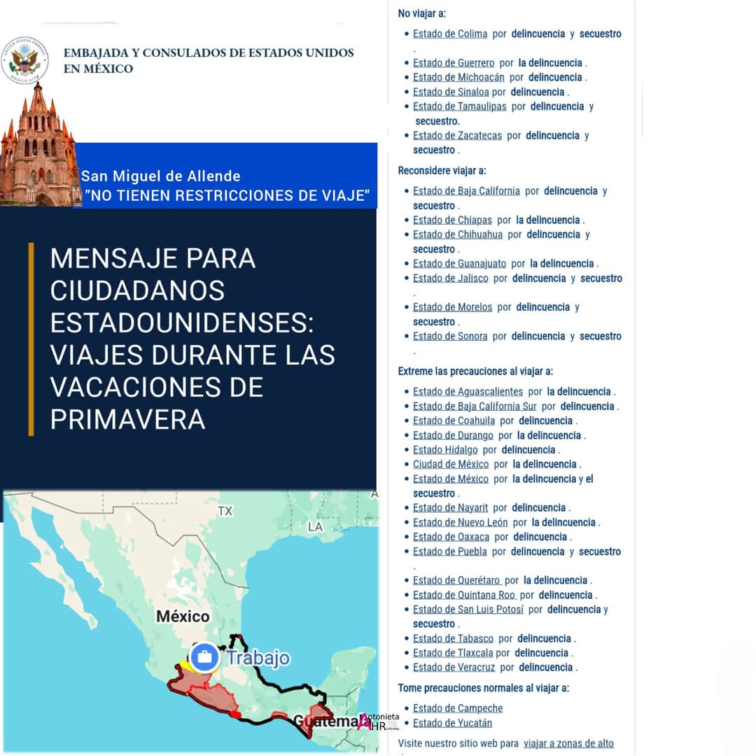 #México #UltimaHora #SanMigueldeAllende EMBAJADA Y CONSULADOS DE ESTADOS UNIDOS EN MÉXICO ADVIERTEN A ESTADOUNIDENSES DE VIAJAR A MÉXICO EN PRIMAVERA 2025 PRINCIPALMENTE A ESTADOS DEL CENTRO DE MÉXICO ENTRE ELLOS VARIOS MUNICIPIOS DE GUANAJUATO ASÍ COMO TULÚM, PLAYA DEL CARMEN Y CANCÚN, POR DELINCUENCIA
