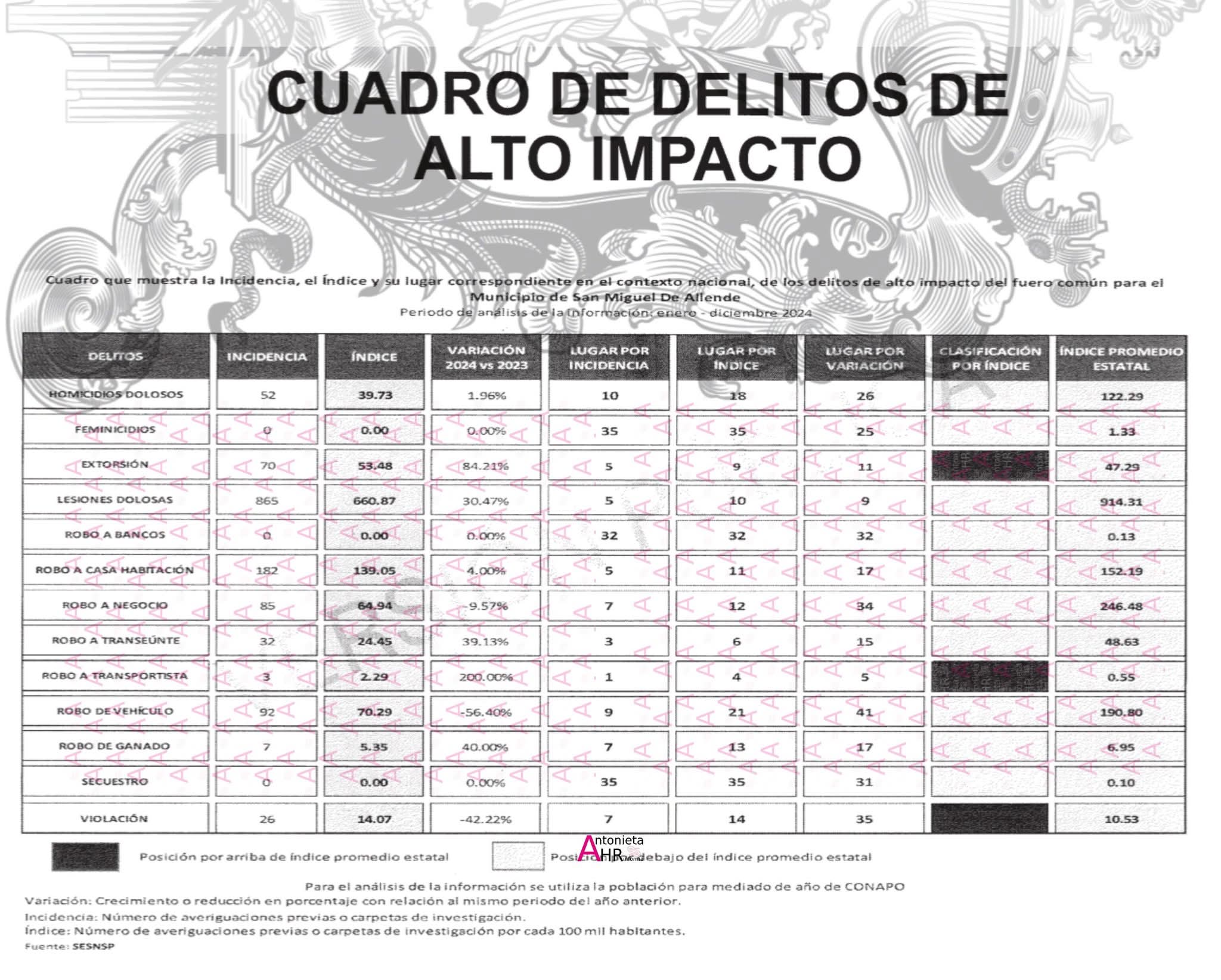 Determinaron que la incidencia de los delitos de alto impacto del fueron común que prevalecen en San Miguel de Allende son: «Lesiones Dolosas» en primer lugar, «Robo a Casa habitación» en segundo lugar, «Robo de vehículos» en tercer lugar, «Robo a negocios» en cuarto lugar, «extorsión» en quinto lugar y «homicidios dolosos» en sexto lugar. Mientras que feminicidios, robos a bancos y secuestros son los ultimos con 0%