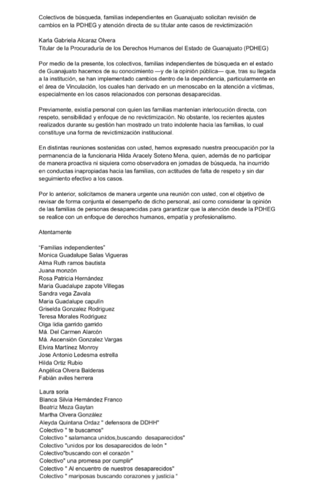 Ante el pronunciamiento realizado por los Colectivos de Búsqueda y familias independientes en Guanajuato, esta Procuraduría manifiesta lo siguiente: