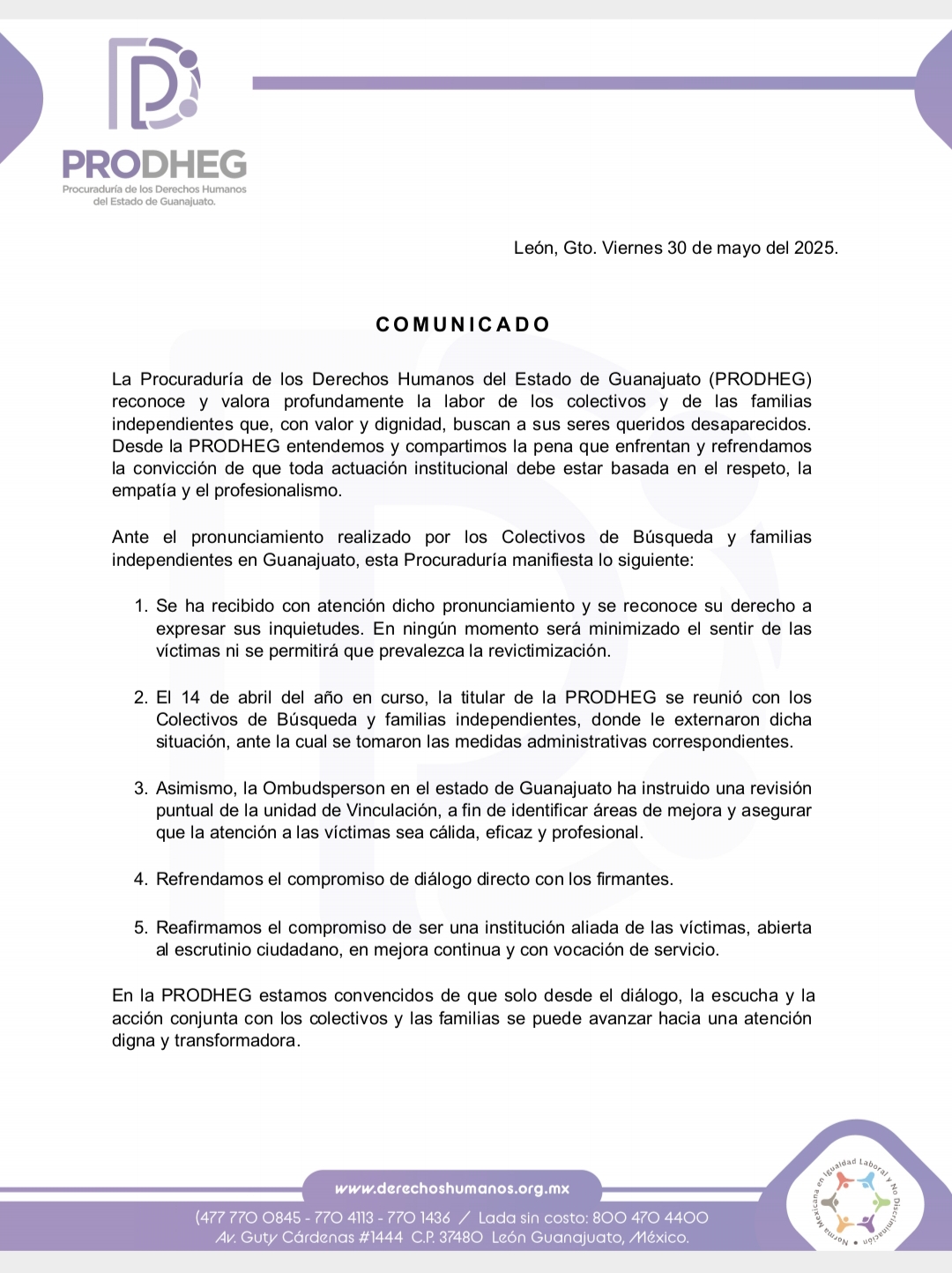 La Procuraduría de los Derechos Humanos del Estado de Guanajuato (PRODHEG) reconoce y valora profundamente la labor de los colectivos y de las familias independientes que, con valor y dignidad, buscan a sus seres queridos desaparecidos. Desde la PRODHEG entendemos y compartimos la pena que enfrentan y refrendamos la convicción de que toda actuación institucional debe estar basada en el respeto, la empatía y el profesionalismo.