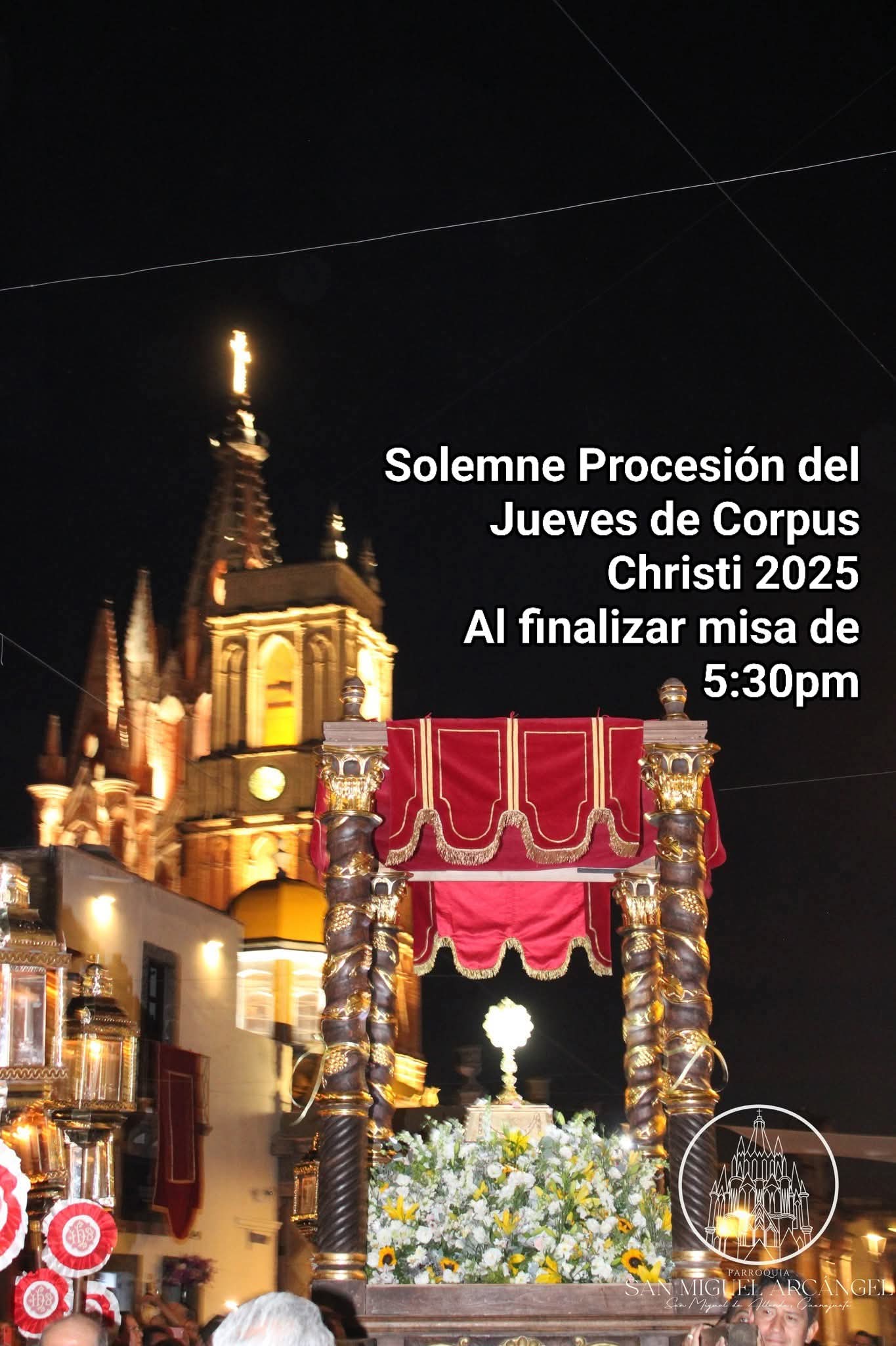 SAN MIGUEL DE ALLENDE, GTO., MIÉRCOLES 18 DE JUNIO 2025.- El recorrido de la esperada procesión del Jueves de Corpus 2025, será este jueves 19 de junio al término de la misa a las 5:30pm y su recorrido, será por el nuevo acomodo de «las visitas del santísimo» a los diferentes templos de la zona centro.