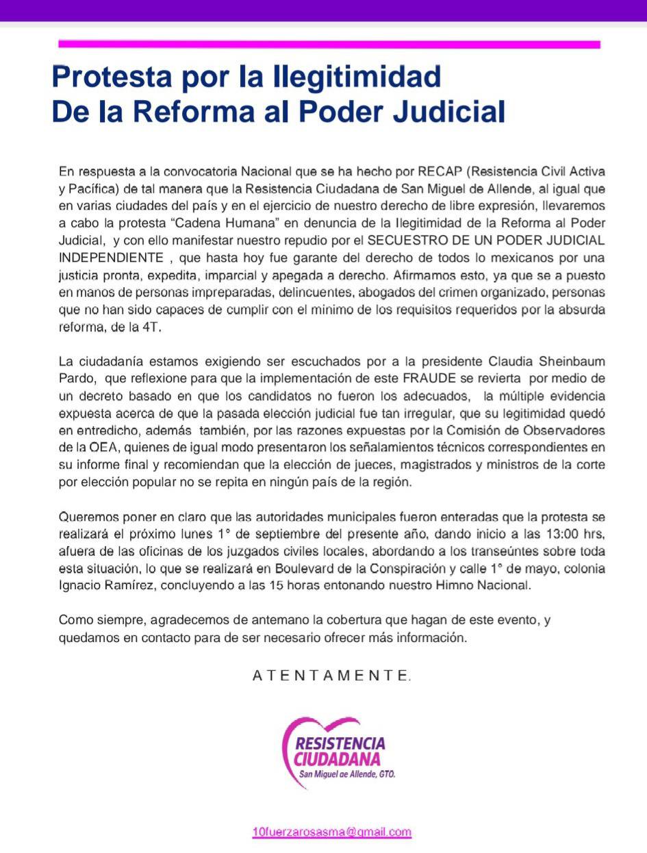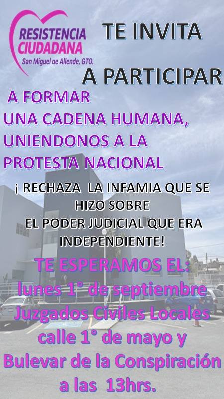 y Pacífica) de tal manera que la Resistencia Ciudadana de San Miguel de Allende, al igual que en varias ciudades del país y en el ejercicio de nuestro derecho de libre expresión, llevaremos a cabo la protesta “Cadena Humana” en denuncia de la Ilegitimidad de la Reforma al Poder Judicial, y con ello manifestar nuestro repudio por el SECUESTRO DE UN PODER JUDICIAL