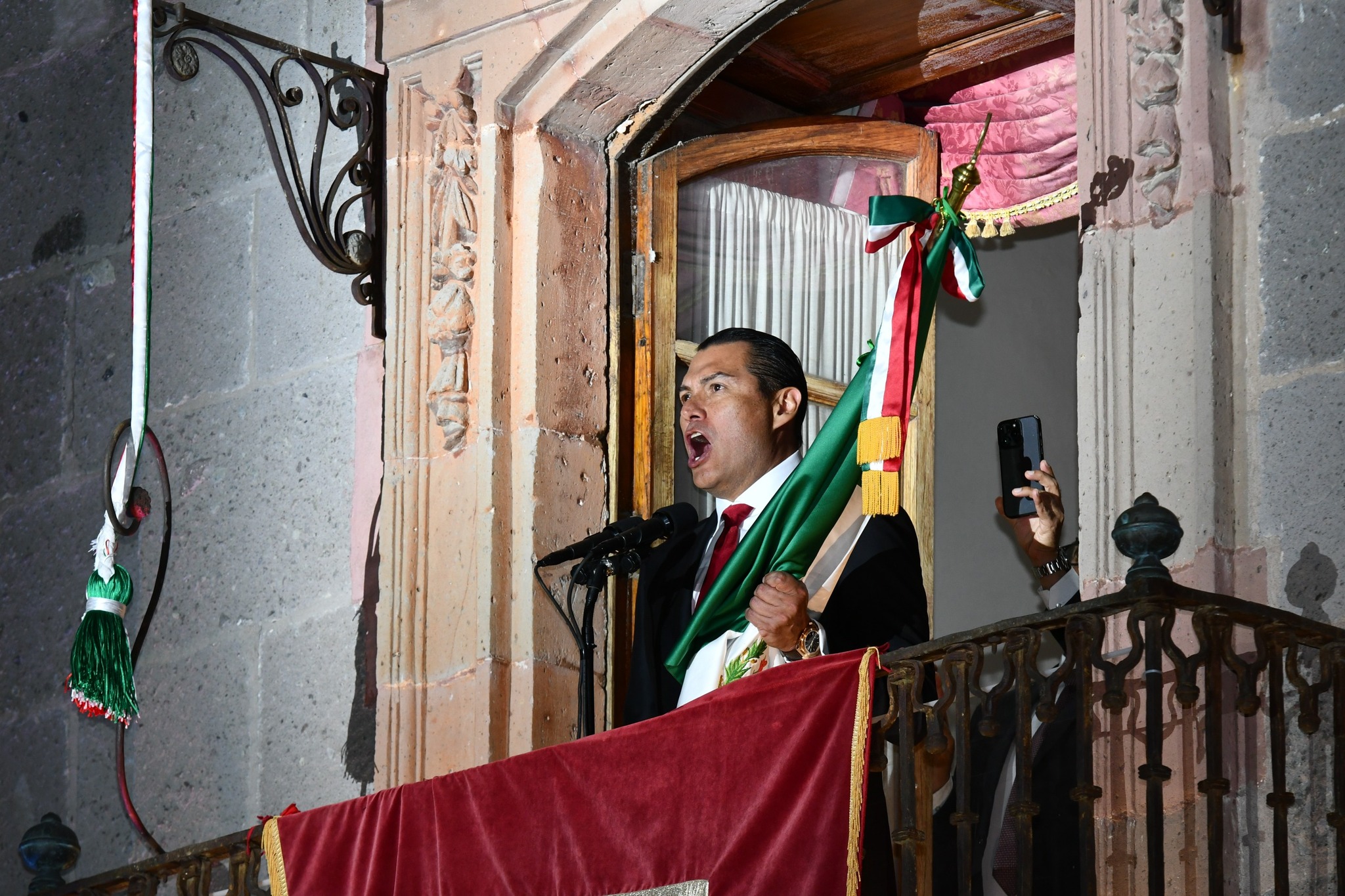 Desde el majestuoso balcón de la Casa de Don Ignacio Allende y Unzaga, el Alcalde sanmiguelense pronunció la arenga oficial que recordó a los héroes patrios. Las campanas resonaron, el público respondió con entusiasmo a cada “¡Viva!” y la noche se llenó de luces, música y emociones.