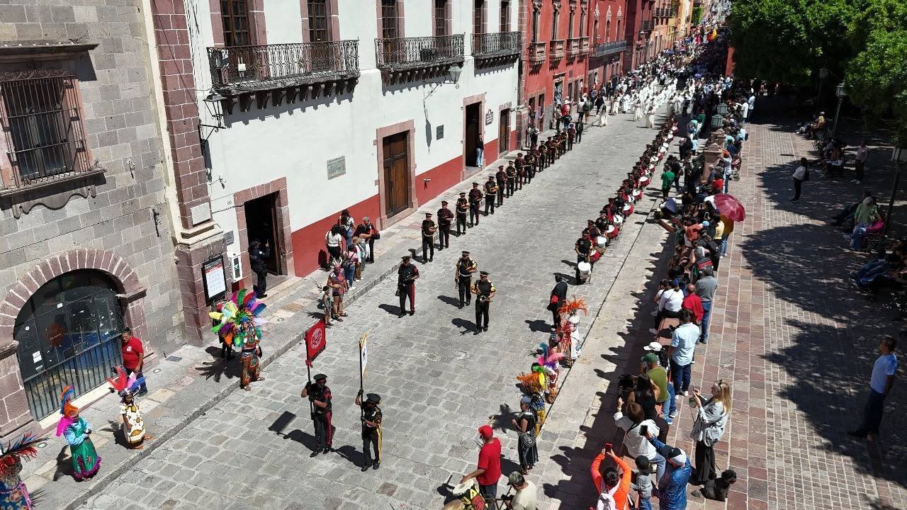 Pero el momento exacto donde se combinaron fue desde la altura del templo de San Francisco hacia la Parroquia de San Miguel Arcángel dónde a una sola marcha con toques de ordenanza en honor a señor San Miguel Arcángel lograron unir los 40 elementos de las bandas de guerra y lucir al frente de la comitiva los dos guiones al unísono.