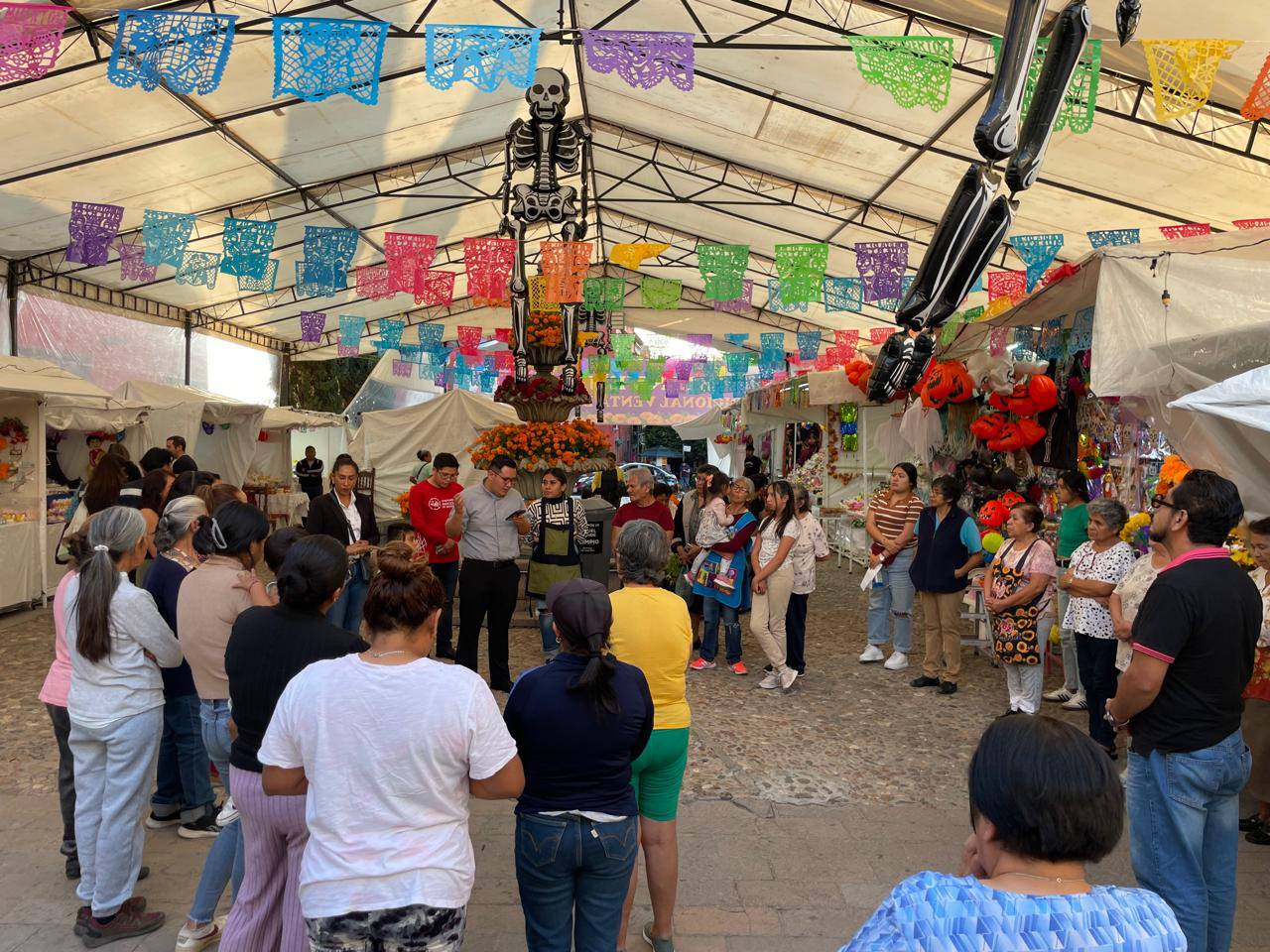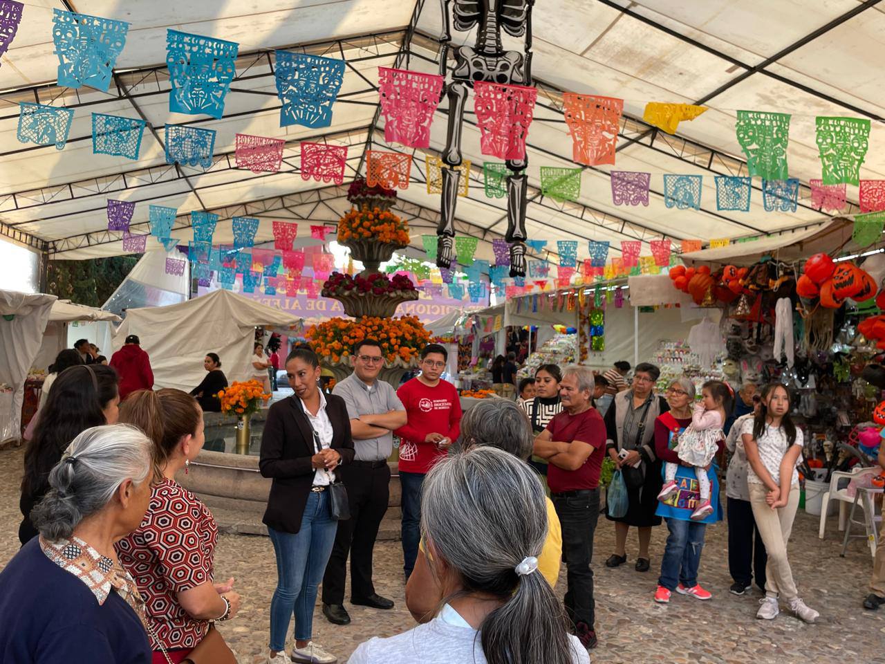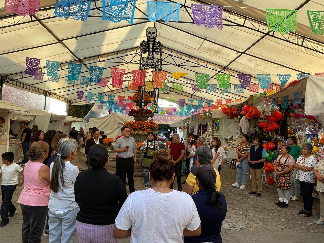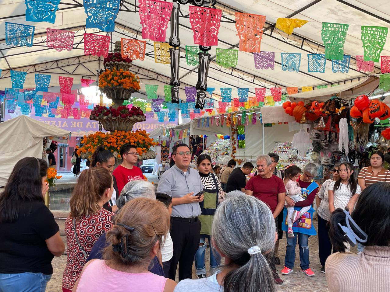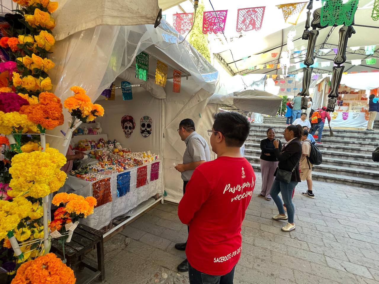 De manera sorpresiva, comerciantes de la Feria de Alfeñique 2025 recibieron la visita del sacerdote, José Juan Ruiz y el seminarista, Arturo Hernández Luna, en compañía de la licenciada Alejandra Aguado del gobierno municipal de San Miguel de Allende, para ofrecer una bendición a los puestos y seguir con su vendimia.