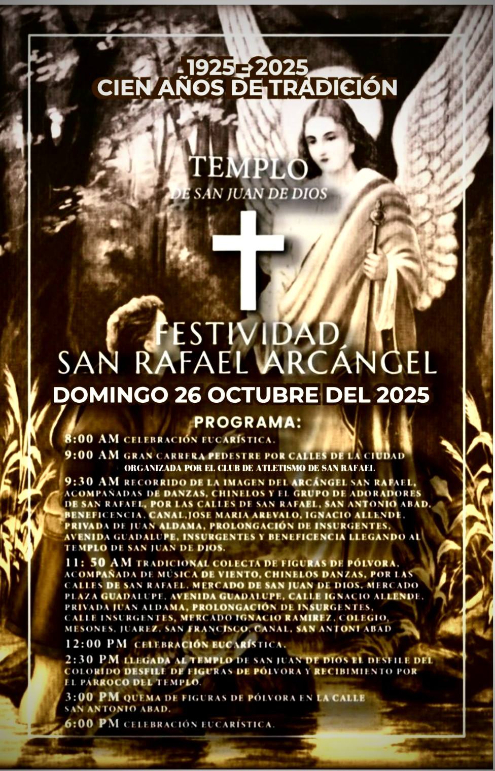 SAN MIGUEL DE ALLENDE,GTO., SÁBADO 25 DE OCTUBRE 2025.- Este fin de semana se cumplirán 100 años de la tradición de la «Festividad San Rafael Arcángel» del Templo de San Juan de Dios, del año 1925 al 2025.