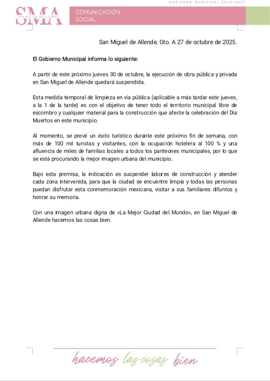 A partir de este próximo jueves 30 de octubre, la ejecución de obra pública y privada en San Miguel de Allende quedará suspendida.