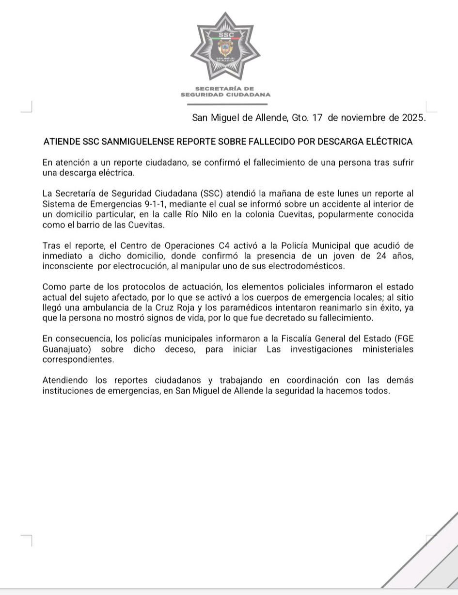 #SanMigueldeAllende #ComunicadoOficial ATIENDE SSC SANMIGUELENSE REPORTE SOBRE FALLECIDO POR DESCARGA ELÉCTRICA