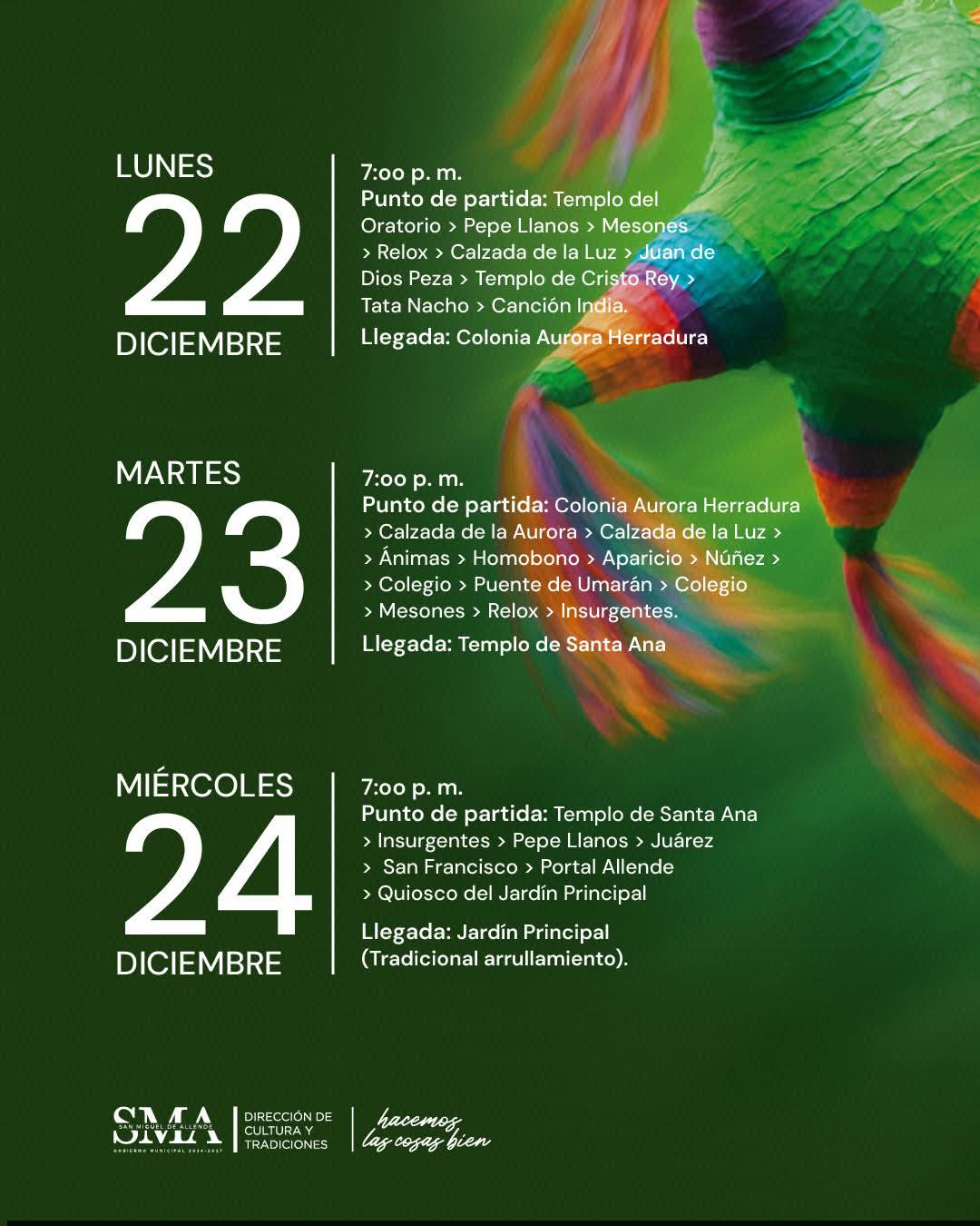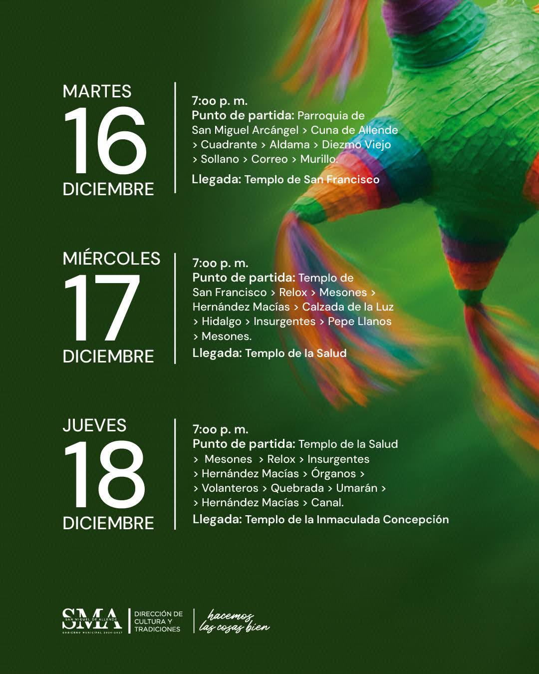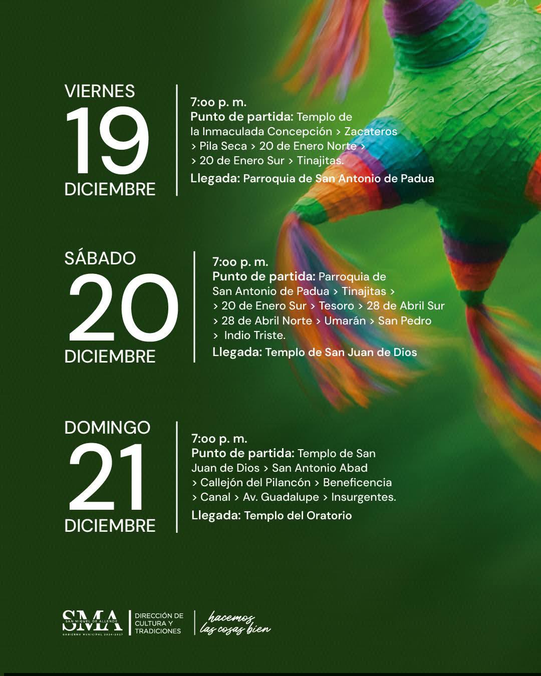 SAN MIGUEL DE ALLENDE, GTO., MIÉRCOLES 10 DE DICIEMBRE 2025.- Del 16 al 24 de diciembre 2025, cada día el recorrido DE LA POSADA PÚBLICA saldrá a las 7pm de diferentes puntos donde arriba casa noche.