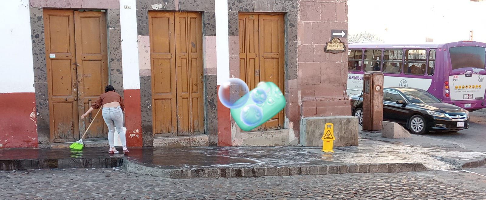 #Denuncia dice: En meses anteriores en la esquina de MESONES Esquina Juárez y esquina Colegio, ya se les habían dicho que no lavaran con jabón la banqueta porque se patina la gente PRINCIPALMENTE PERSONAS DE LA TERCERA EDAD y las motos que pasan en la mañana (por la piedra sanmiguelita enjabonada) derrapan., En una ocasión ya los multaron y también se les informó a otros de los negocios vecinos., PERO nuevamente están lavando con jabón, les dijeron QUE SÍ PUEDEN LAVAR pero poco la banqueta sin jabón., porque acostumbran aventar el jabón al arroyo vial donde se vuelve peligroso con la piedra sanmiguelita.