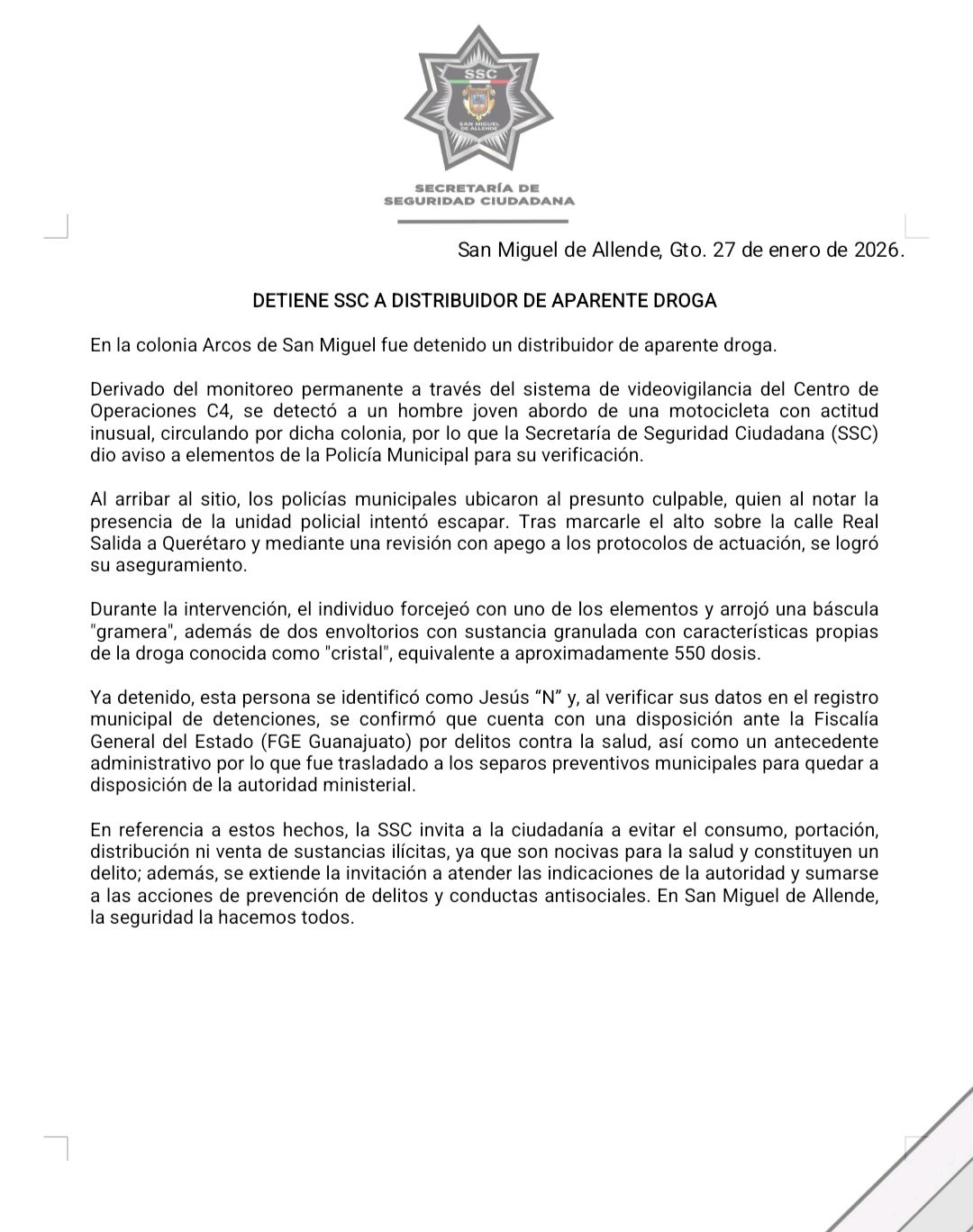 En referencia a estos hechos, la SSC invita a la ciudadanía a evitar el consumo, portación, distribución ni venta de sustancias ilícitas, ya que son nocivas para la salud y constituyen un delito; además, se extiende la invitación a atender las indicaciones de la autoridad y sumarse a las acciones de prevención de delitos y conductas antisociales. En San Miguel de Allende, la seguridad la hacemos todos.