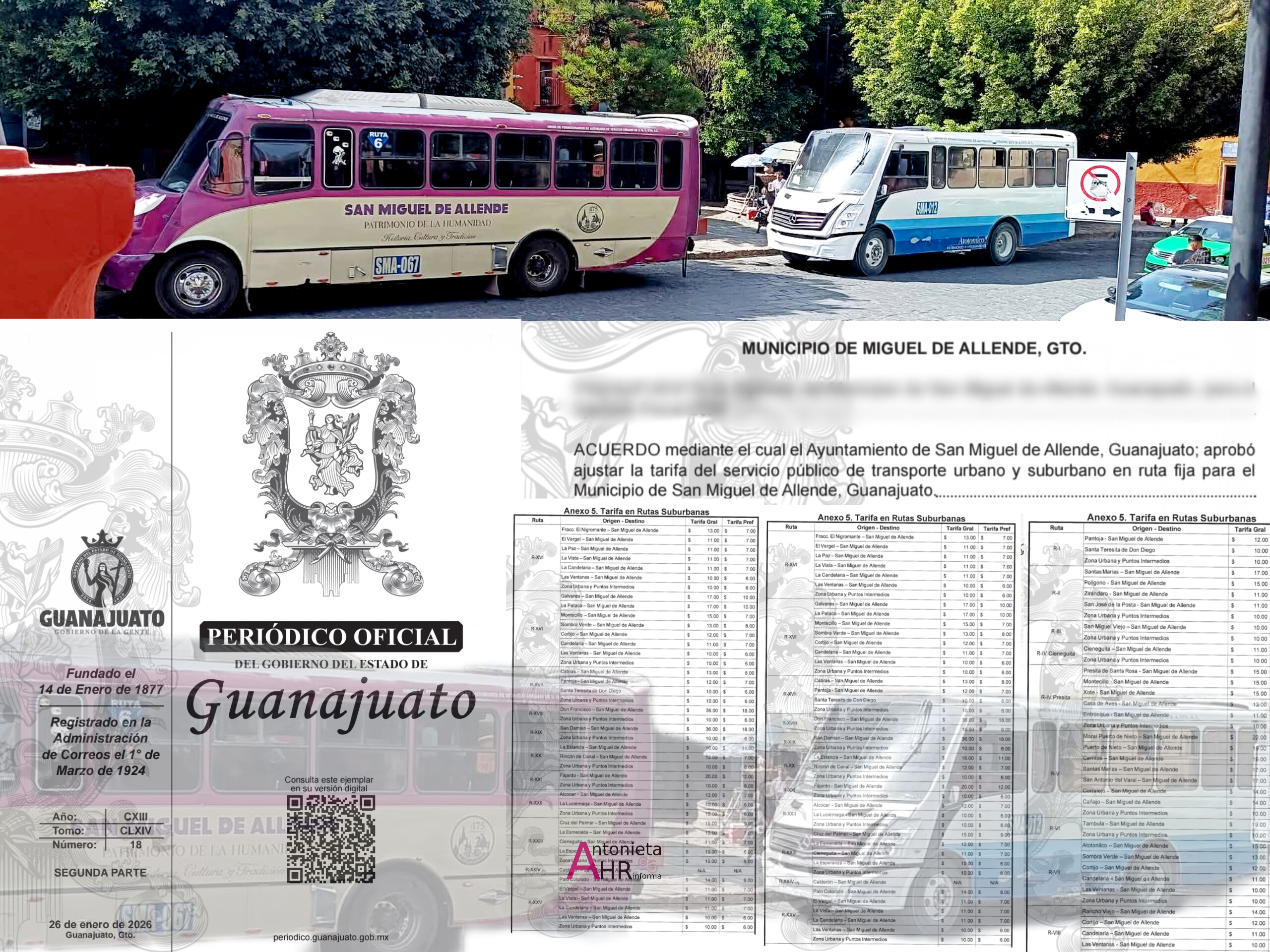 Con fecha del 26 de enero 2026, el periódico oficial del Gobierno del Estado, informó la solicitud del 13 de enero 2026 del cambio de tarifas y los compromisos de mejora a los que el servicio de transporte urbano y suburbano, en San Miguel de Allende se comprometieron, establecido por los concecionarios y permisionarios.