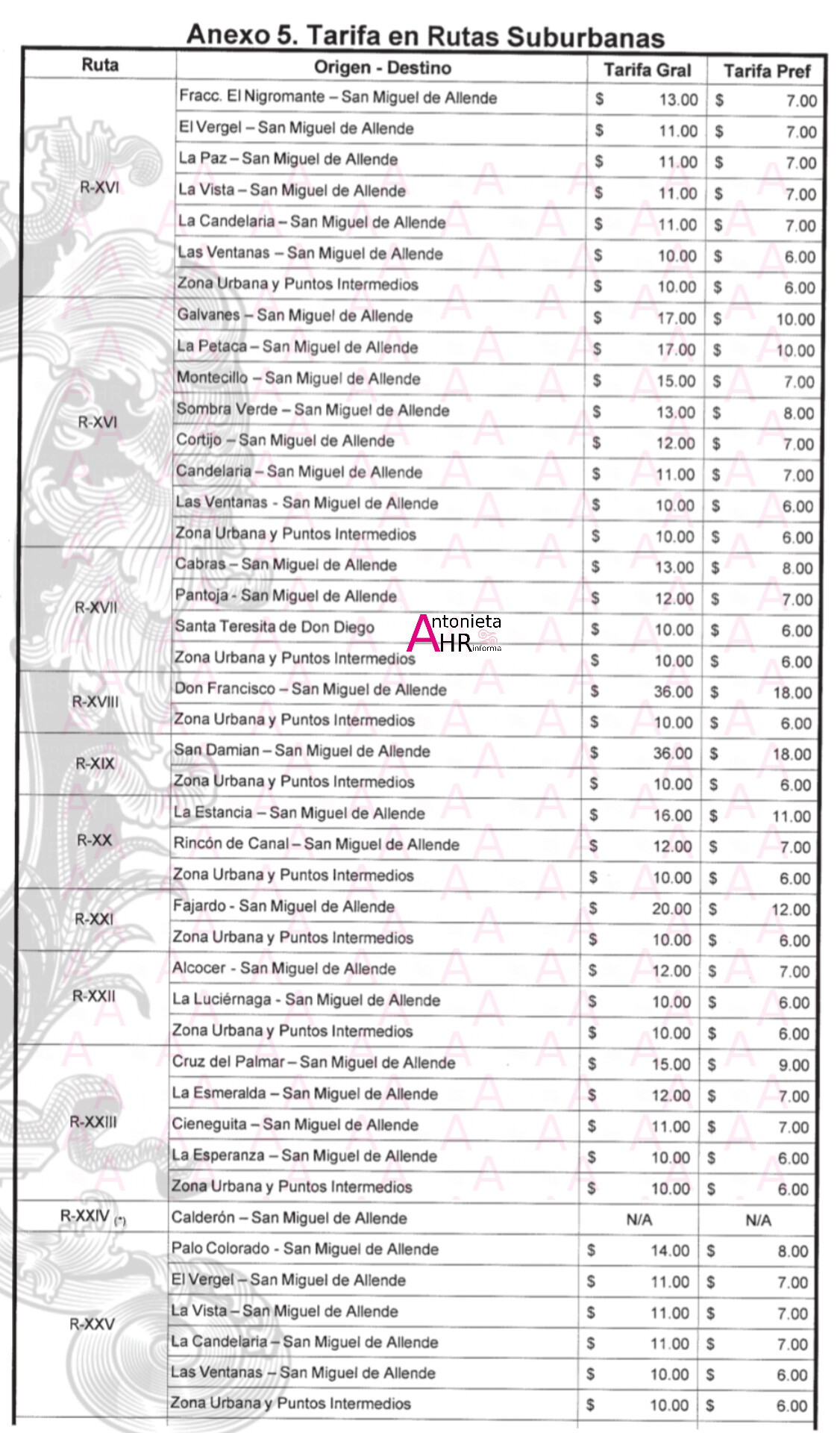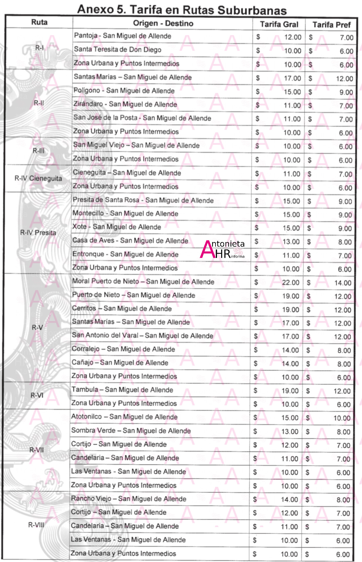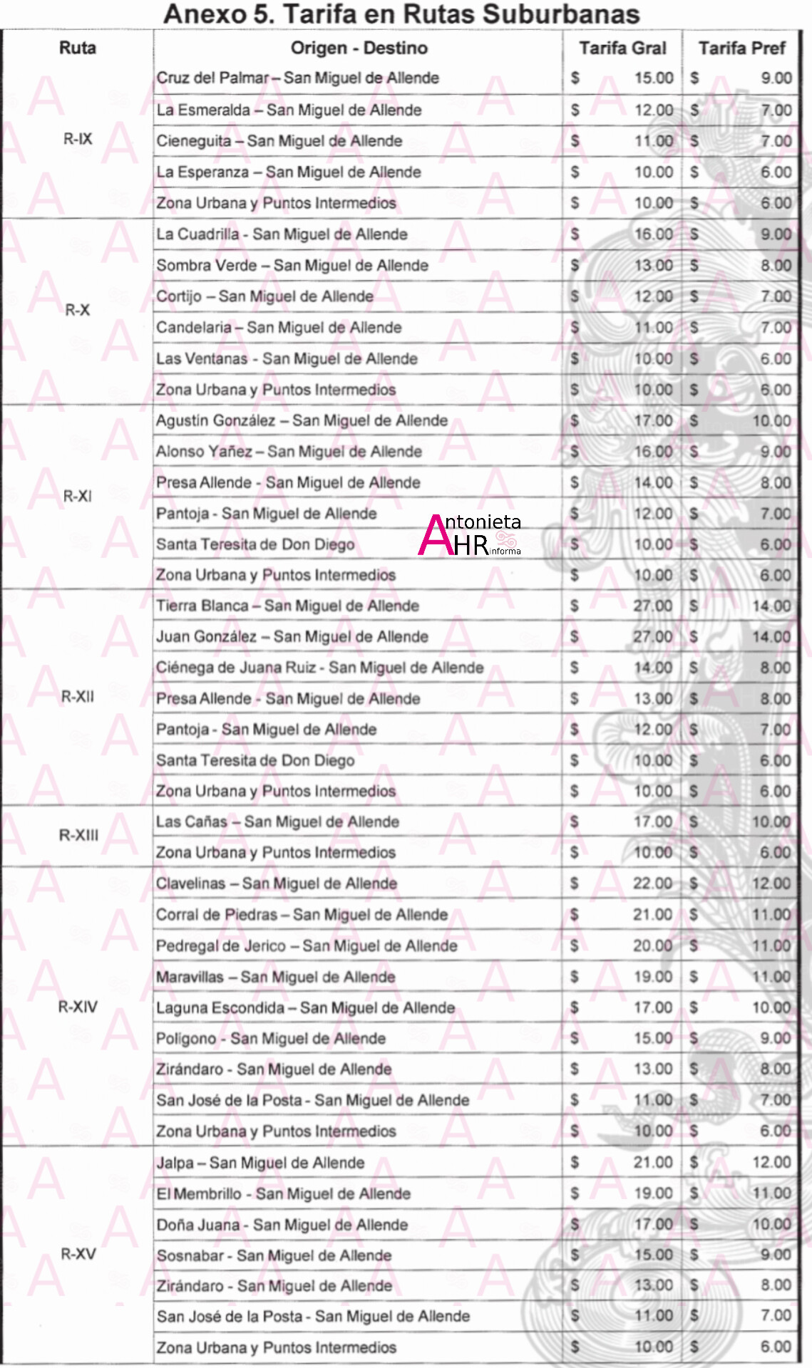 SAN MIGUEL DE ALLENDE, GTO., JUEVES 29 DE ENERO 2026.- Cerrará Enero 2026 con el cobro del aumento al pasaje; zona urbana $10.00 pesos, mientras que para la suburbana; $11.00, $12.00, $15.00, $17.00, $18.00, $19.00, $21.00, $22.00, siendo $27.00 pesos la más alta a Tierra Blanca y Juan González. Abajo te dejamos la tabla de tarifas general y preferencial para adultos, estudiantes, etc.