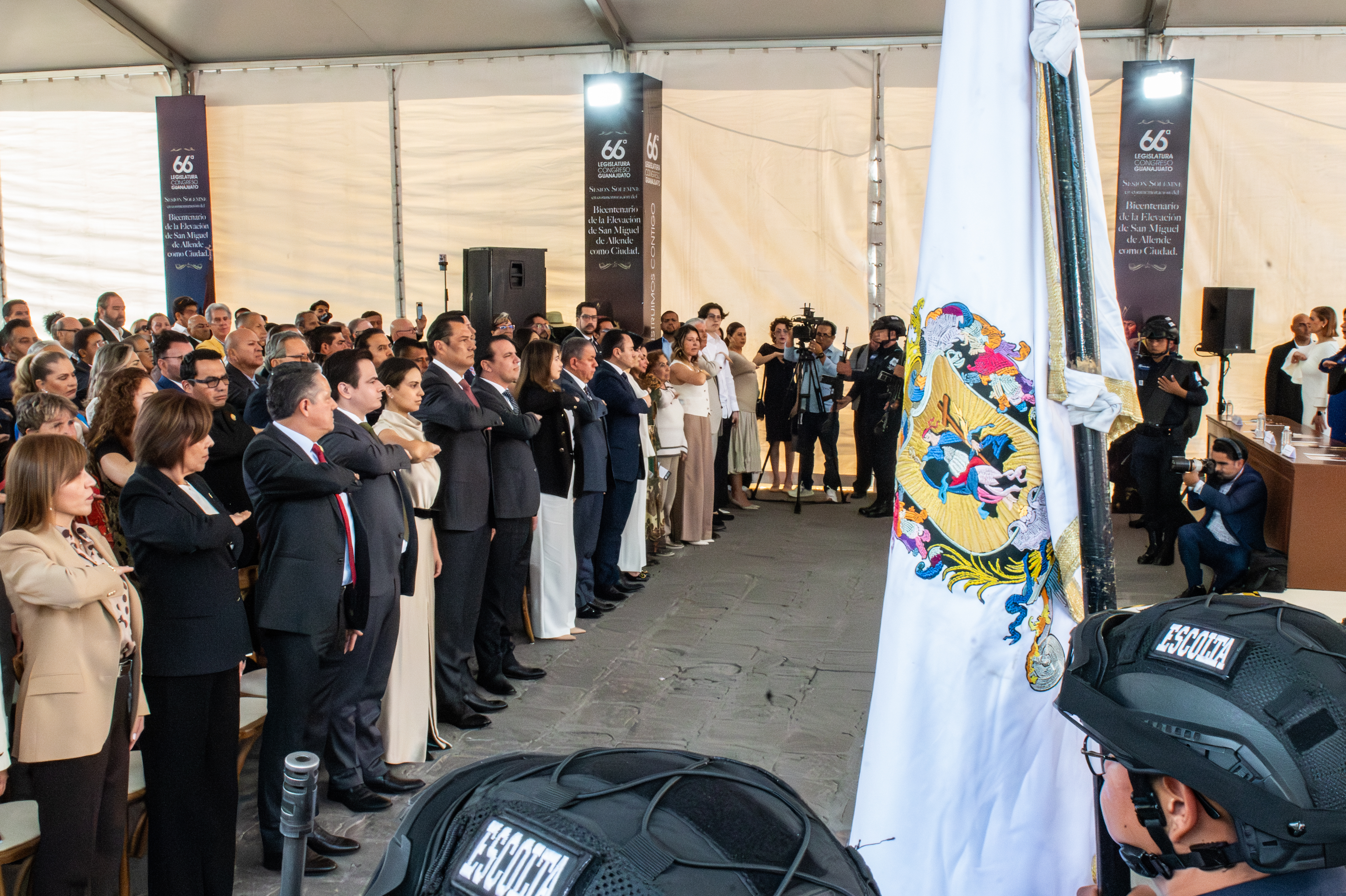 Durante la ceremonia realizada en la explanada del Jardín Principal, el Alcalde recibió a la gobernadora Libia Dennise García Muñoz Ledo, a la presidenta del Congreso del Estado Martha Edith Moreno Valencia y a la magistrada presidenta del Supremo Tribunal de Justicia Alma Delia Camacho Patlán, quienes participaron en la sesión solemne que recordó el decreto del 8 de marzo de 1826, mediante el cual la entonces Villa de San Miguel el Grande fue elevada a la categoría de Ciudad y adoptó el nombre de San Miguel de Allende, en honor al insurgente Ignacio Allende.
