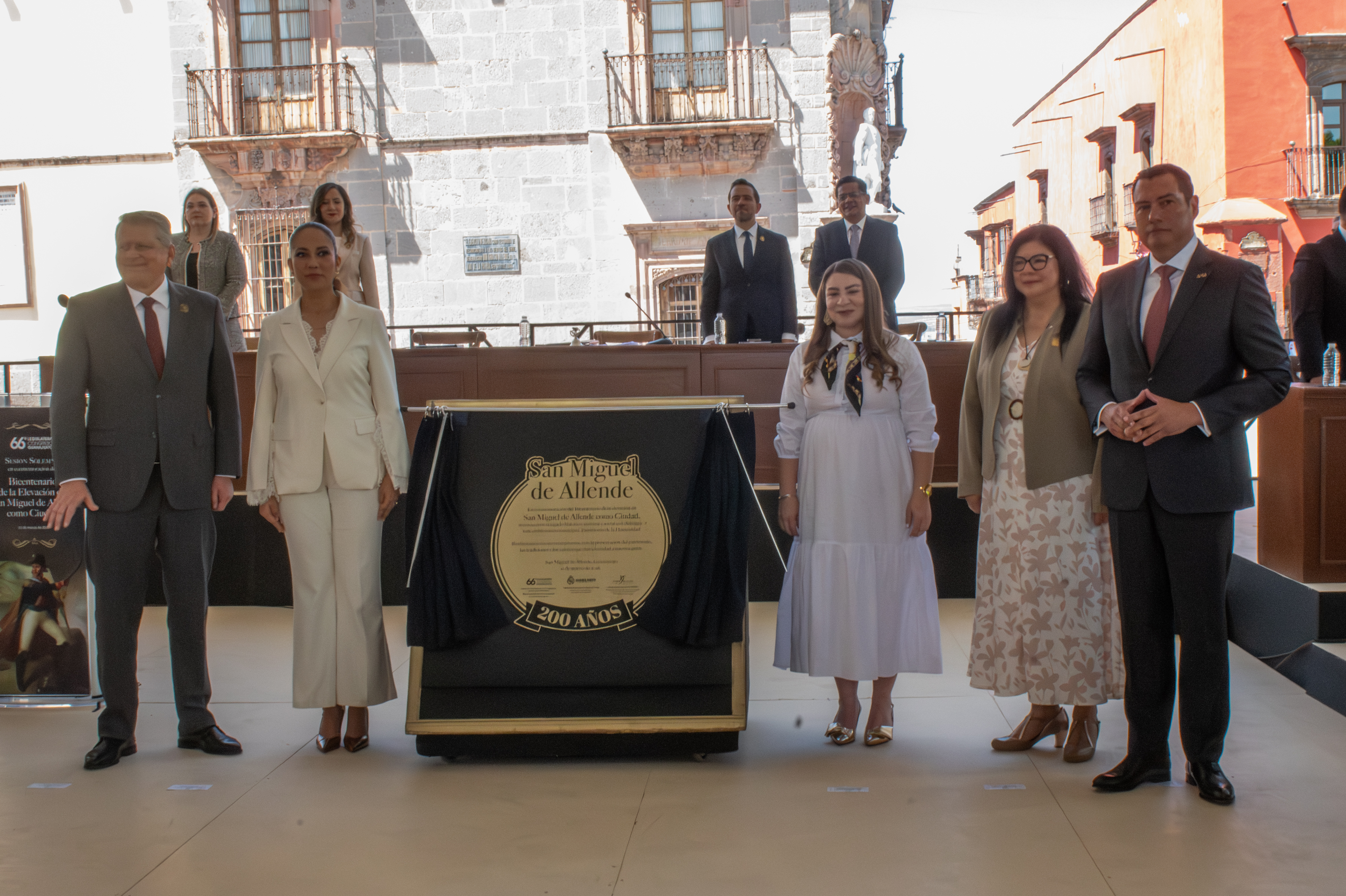 Como parte del acto protocolario, representantes de los tres Poderes del Estado y el Presidente Municipal develaron una placa conmemorativa, en reconocimiento al legado histórico, cultural y social de San Miguel de Allende como Ciudad Patrimonio de la Humanidad.