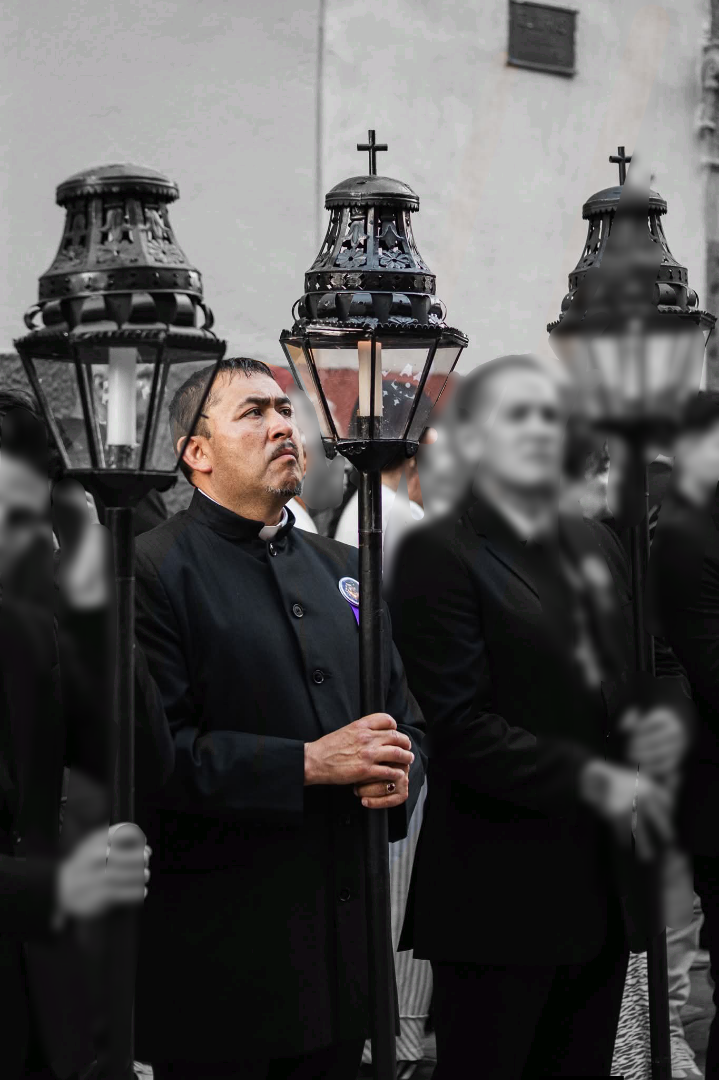 No recordamos otro momento en esta procesión del Santo Entierro, de un momento similar, pero que sorpresa y ejemplo de servicio nos dio el sacerdote Francisco Campos Tovar, colgó el atuendo elegante, se puso el alzacuello y cargó farolas. A eso se le llama «liderazgo servidor».