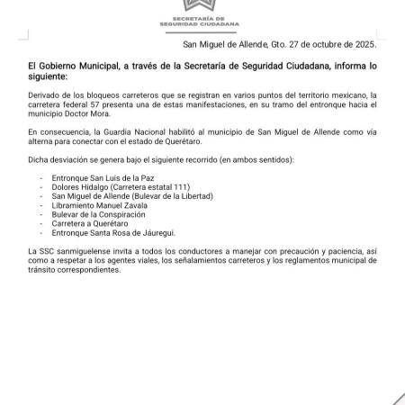 TRAS LOS BLOQUEOS CARRETEROS INFORMA GOBIERNO MUNICIPAL DE SAN MIGUEL DE ALLENDE