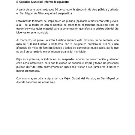 27 de octubre de 20255 de noviembre de 2025 Equipo Redacción A partir de este próximo jueves 30 de octubre, la ejecución de obra pública y privada en San Miguel de Allende quedará suspendida