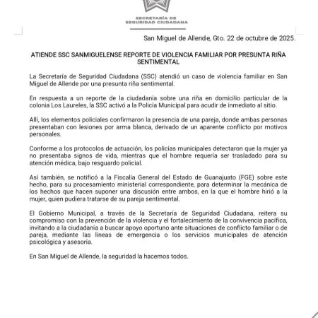 22 de octubre de 20255 de noviembre de 2025 Equipo Redacción ATIENDE SSC SANMIGUELENSE REPORTE DE VIOLENCIA FAMILIAR POR PRESUNTA RIÑA SENTIMENTAL