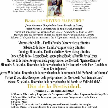 17 de julio de 202417 de julio de 2024 Equipo Redacción FIESTA DEL DIVINO MAESTRO 2024 EN EL TEMPLO DE LA SANTA ESCUELA DE CRISTO