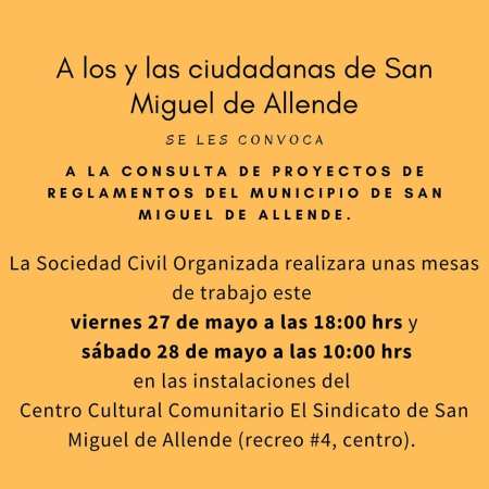 26 de mayo de 202226 de mayo de 2022 Equipo Redacción NVITAN A PARTICIPARÁN EN MESAS DE TRABAJO CIUDADANAS PARA CONSULTA DE REGLAMENTOS QUE QUIEREN APROBAR PARA SAN MIGUEL DE ALLENDE